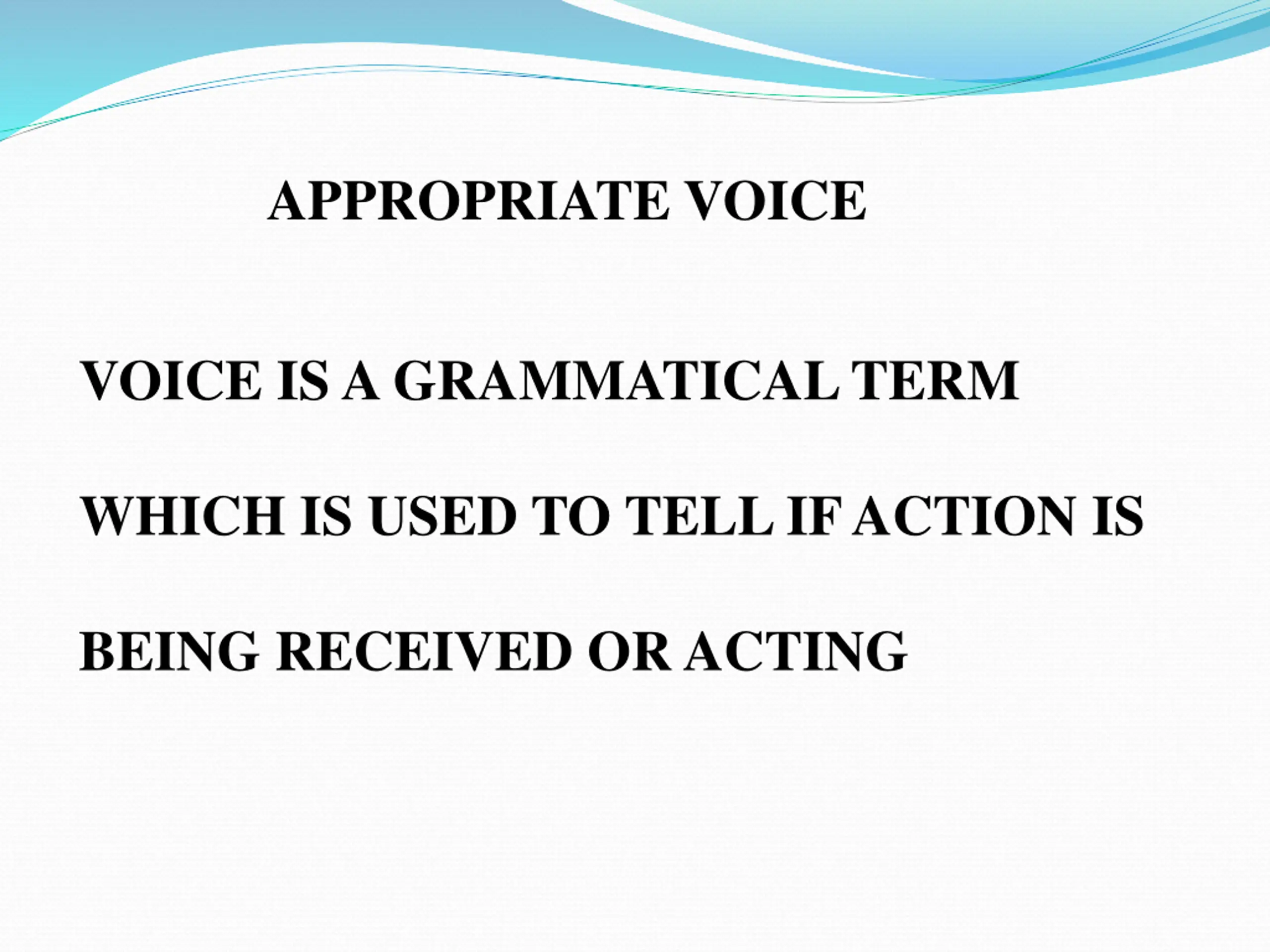 APPROPRIATE VOICE VOICE IS A GRAMMATICAL TERM WHICH IS USED TO TELL IF ACTION IS BEING RECEIVED OR ACTING