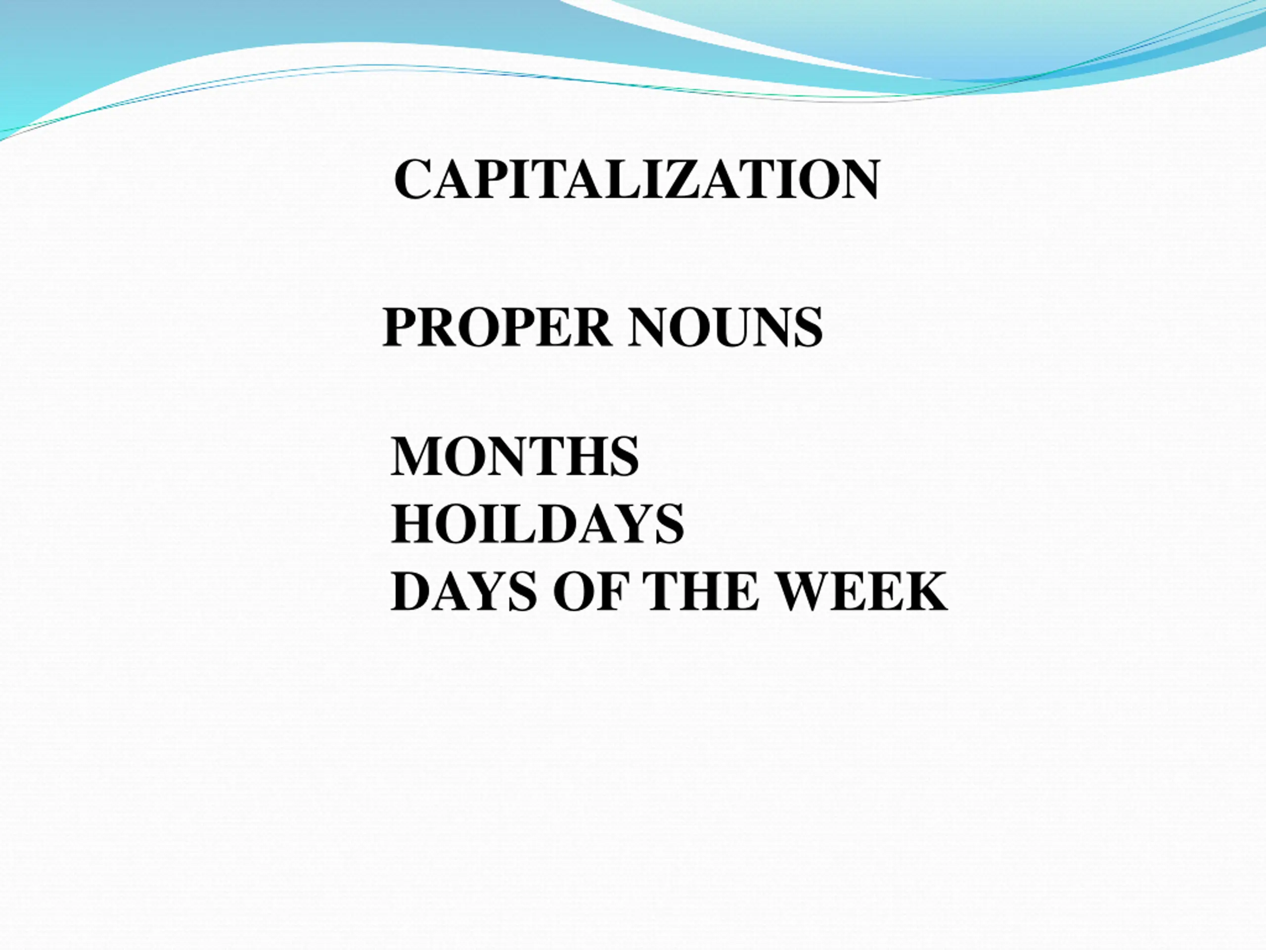 CAPITALIZATION PROPER NOUNS MONTHS HOILDAYS DAYS OF THE WEEK