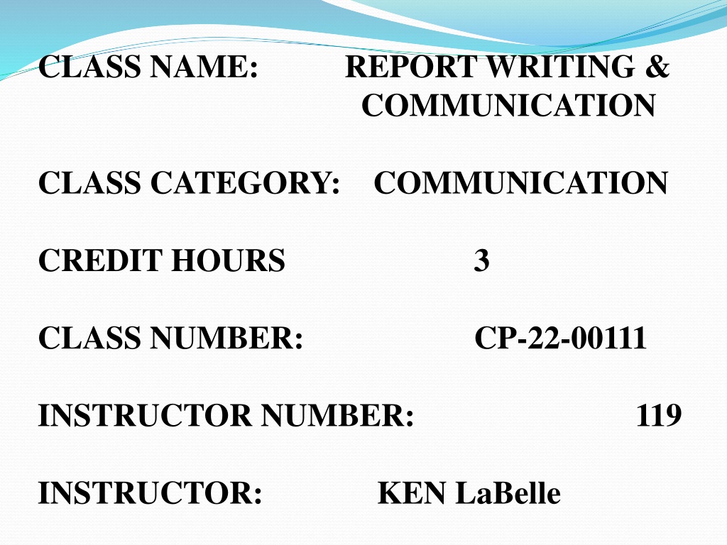 CLASS NAME: REPORT WRITING & COMMUNICATION CLASS CATEGORY: COMMUNICATION CREDIT HOURS 3 CLASS NUMBER: CP-22-00111 INSTRUCTOR NUMBER: 119 INSTRUCTOR: KEN LaBelle