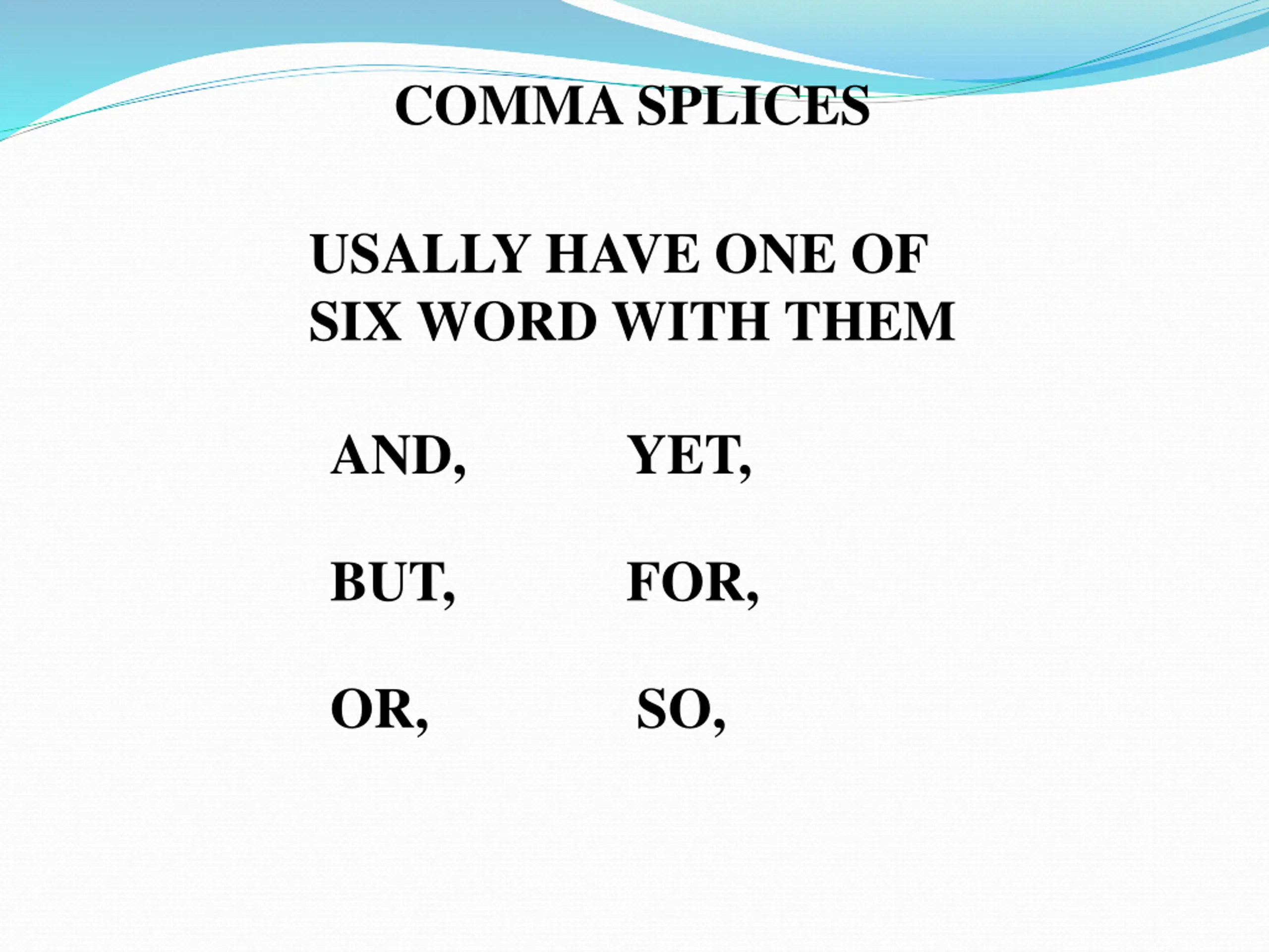 COMMA SPLICES USALLY HAVE ONE OF SIX WORD WITH THEM AND, YET, BUT, FOR, OR, SO,