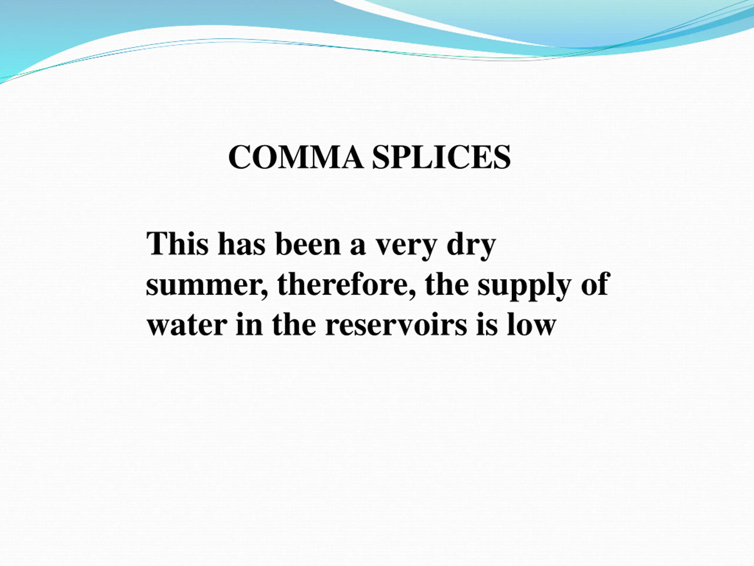 COMMA SPLICES This has been a very dry summer, therefore, the supply of water in the reservoirs is low