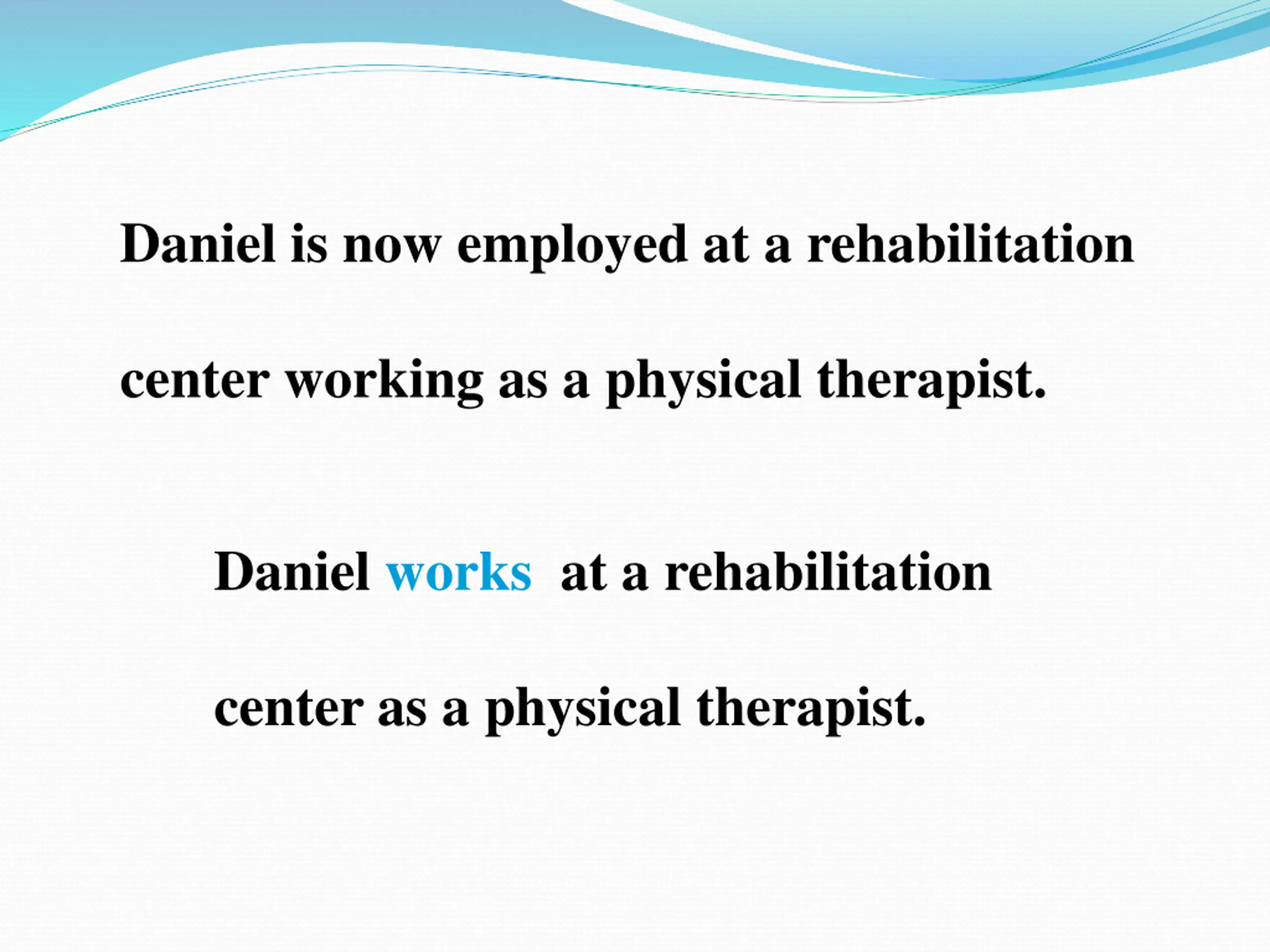 Daniel is now employed at a rehabilitation center working as a physical therapist. Daniel works at a rehabilitation center as a physical therapist.