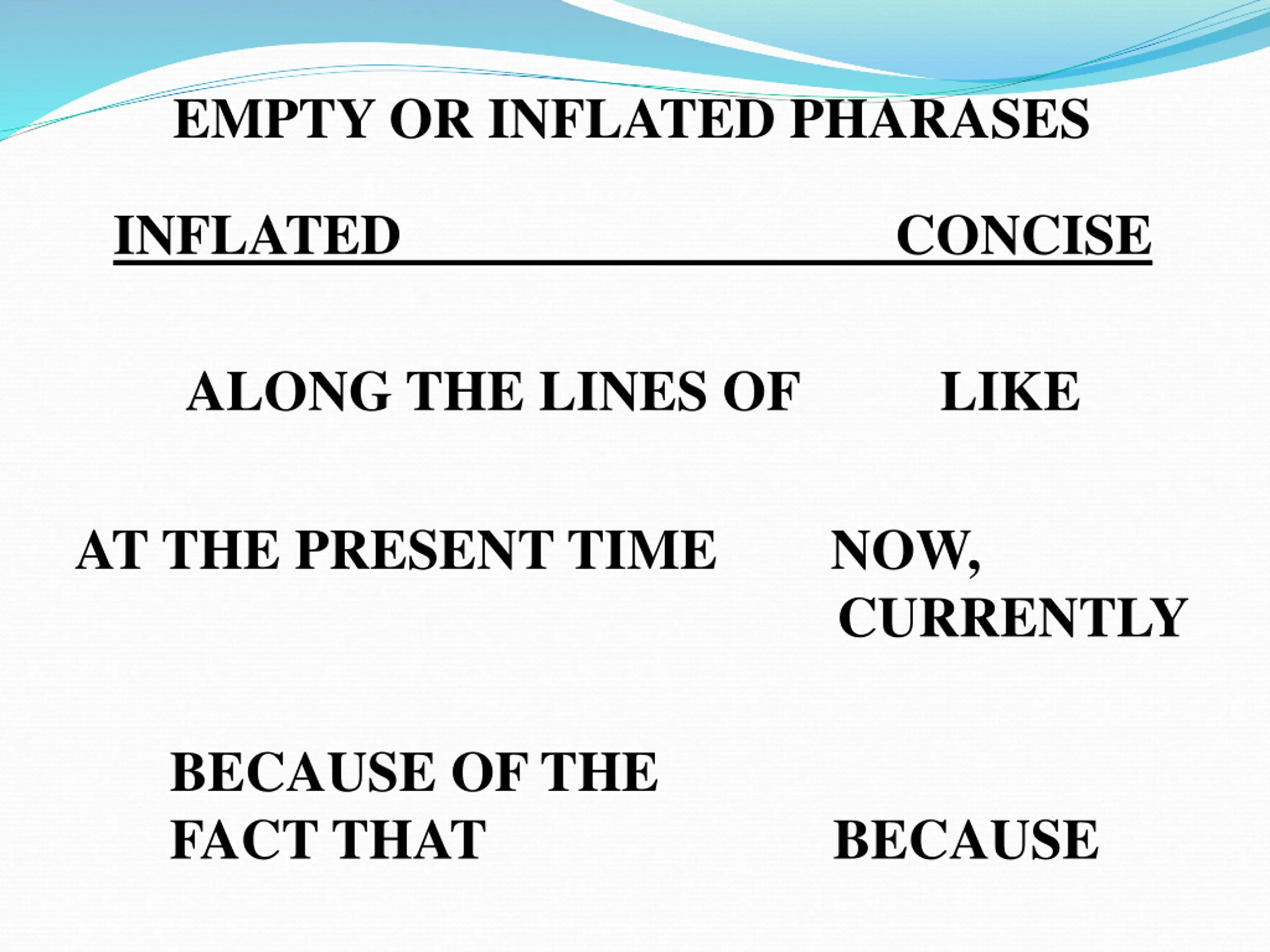 EMPTY OR INFLATED PHARASES INFLATED CONCISE ALONG THE LINES OF LIKE AT THE PRESENT TIME NOW, CURRENTLY BECAUSE OF THE FACT THAT BECAUSE