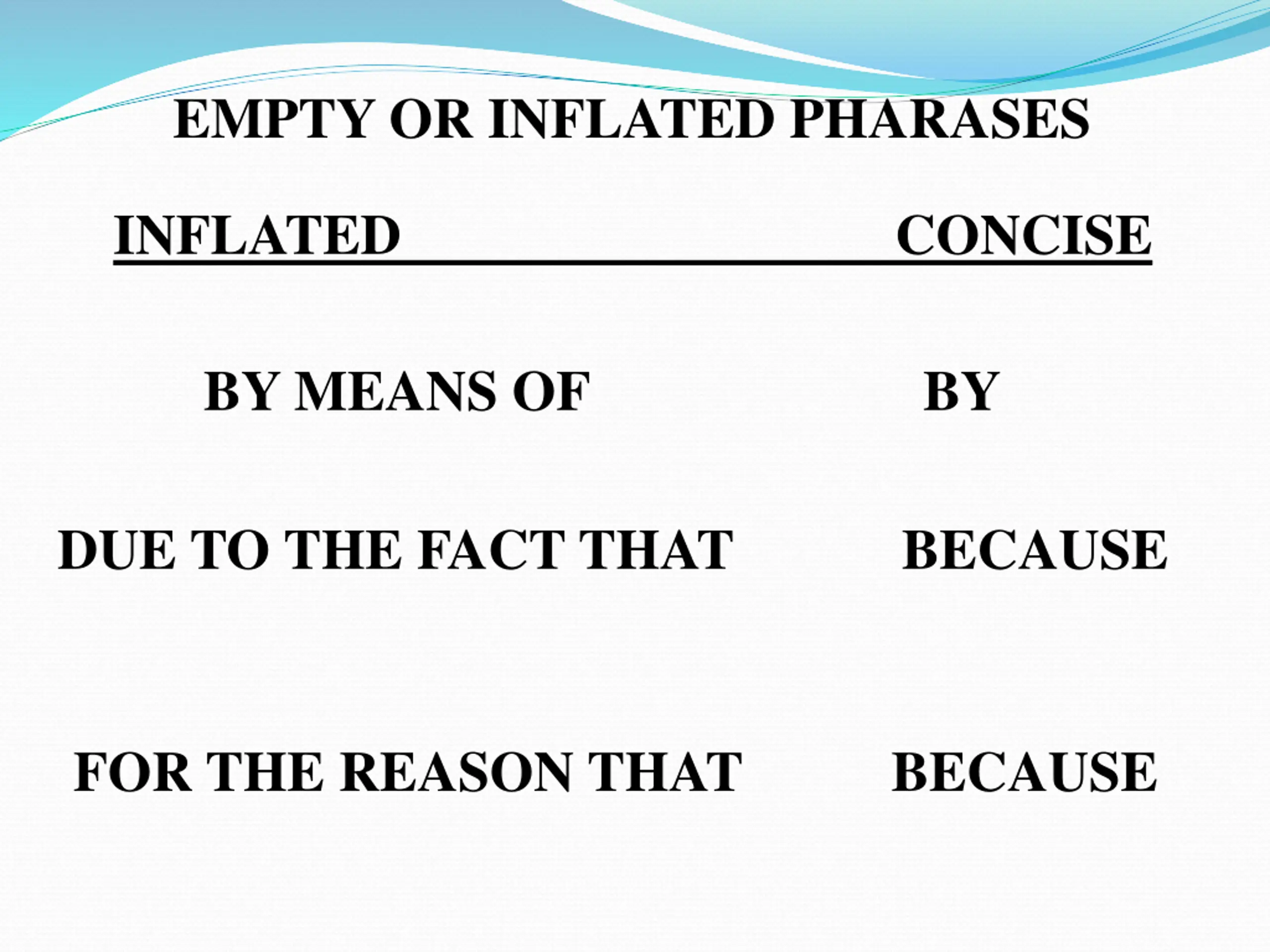 EMPTY OR INFLATED PHARASES INFLATED CONCISE BY MEANS OF BY DUE TO THE FACT THAT BECAUSE FOR THE REASON THAT BECAUSE