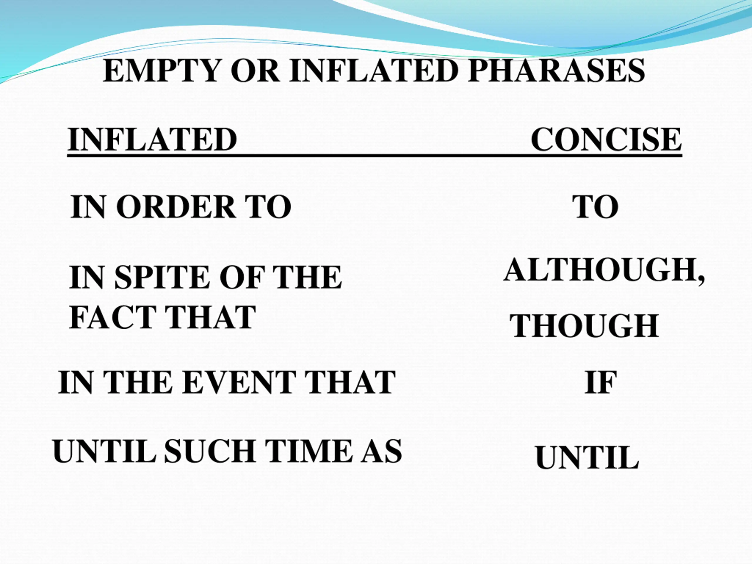 EMPTY OR INFLATED PHARASES INFLATED CONCISE IN ORDER TO TO ALTHOUGH, IN SPITE OF THE FACT THAT THOUGH IN THE EVENT THAT IF UNTIL SUCH TIME AS UNTIL