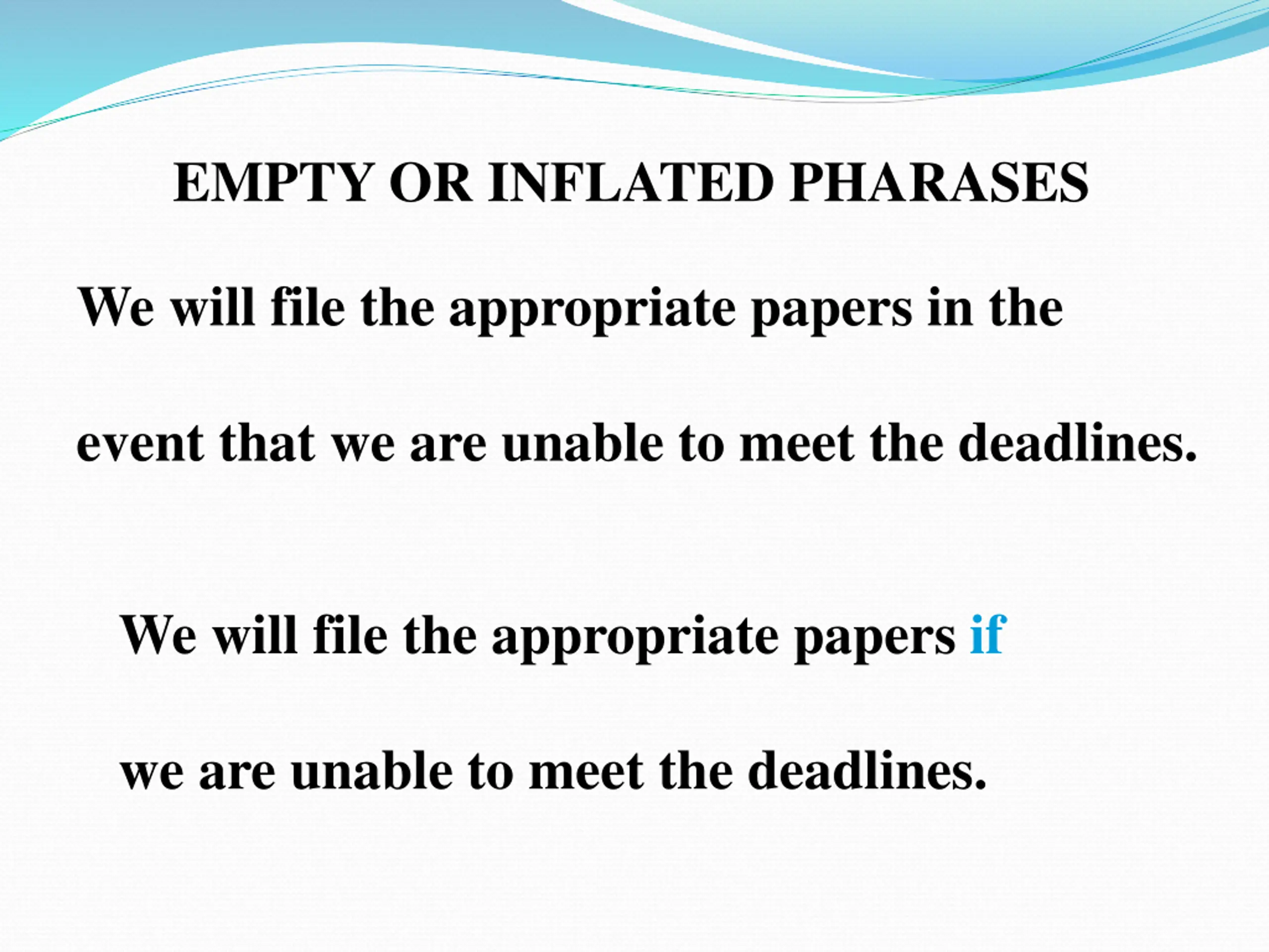 EMPTY OR INFLATED PHARASES We will file the appropriate papers in the event that we are unable to meet the deadlines. We will file the appropriate papers if we are unable to meet the deadlines.