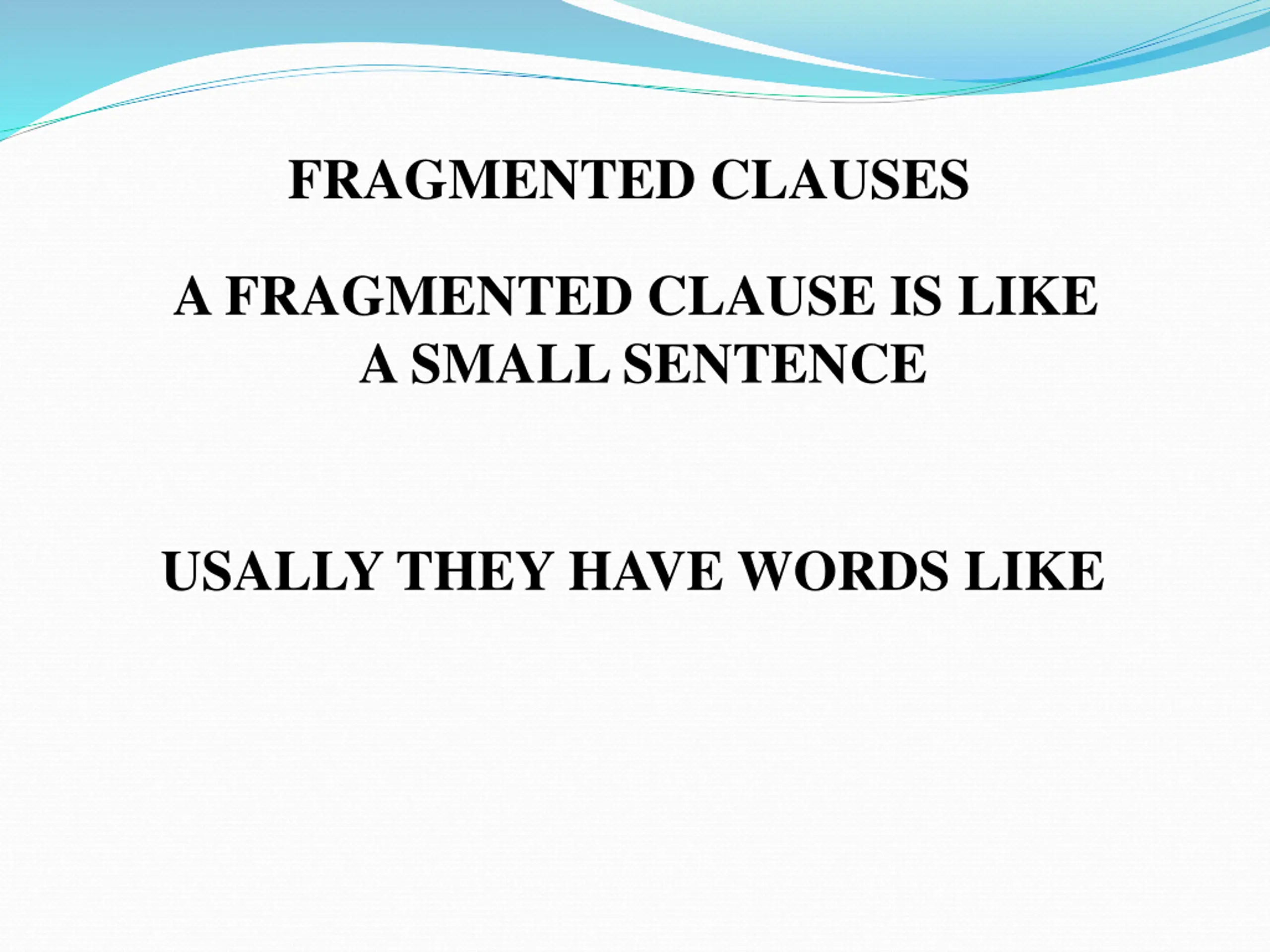 FRAGMENTED CLAUSES A FRAGMENTED CLAUSE IS LIKE A SMALL SENTENCE USALLY THEY HAVE WORDS LIKE