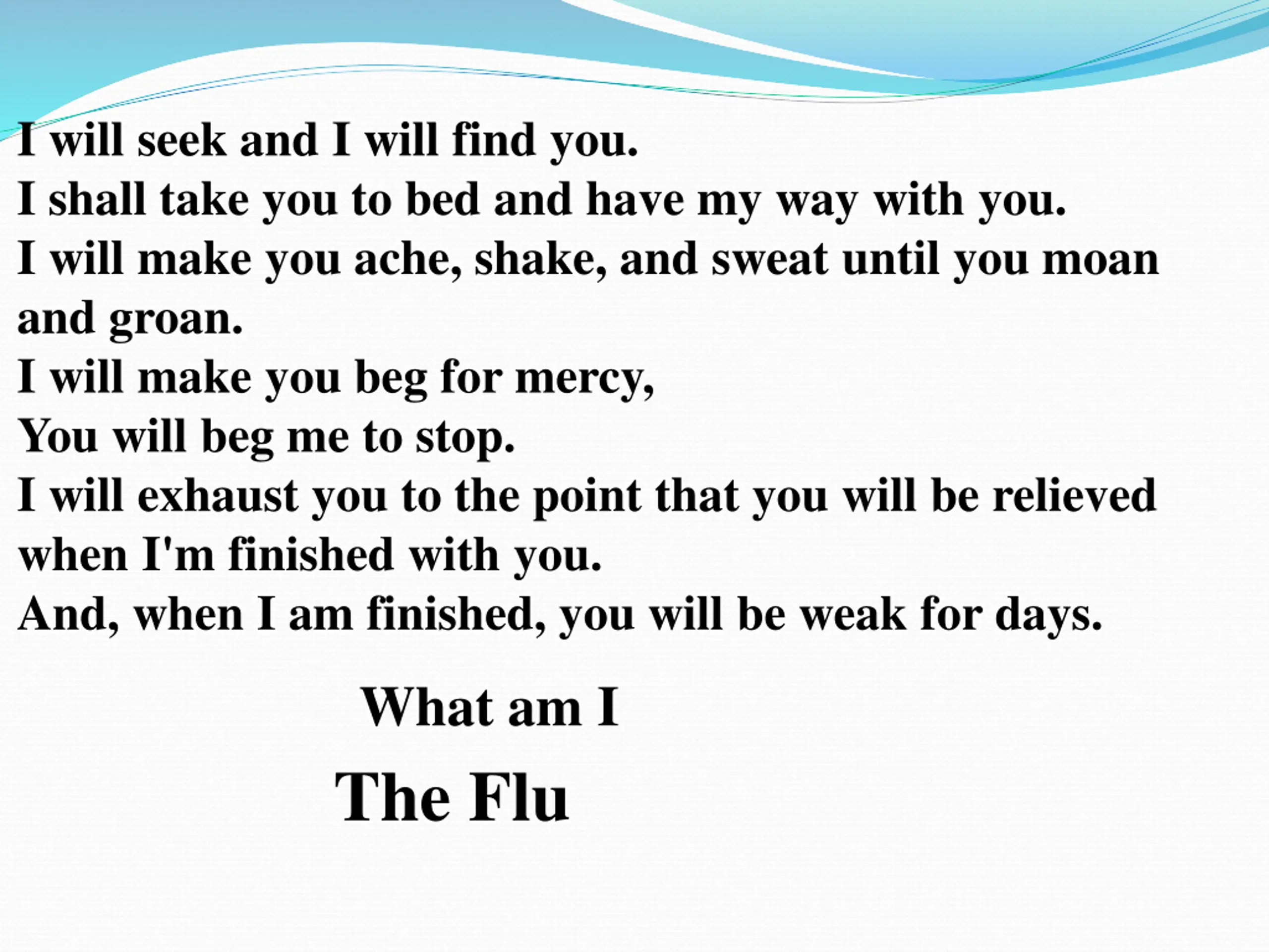 I will seek and I will find you. I shall take you to bed and have my way with you. I will make you ache, shake, and sweat until you moan and groan. I will make you beg for mercy, You will beg me to stop. I will exhaust you to the point that you will be relieved when I'm finished with you. And, when I am finished, you will be weak for days. What am I The Flu