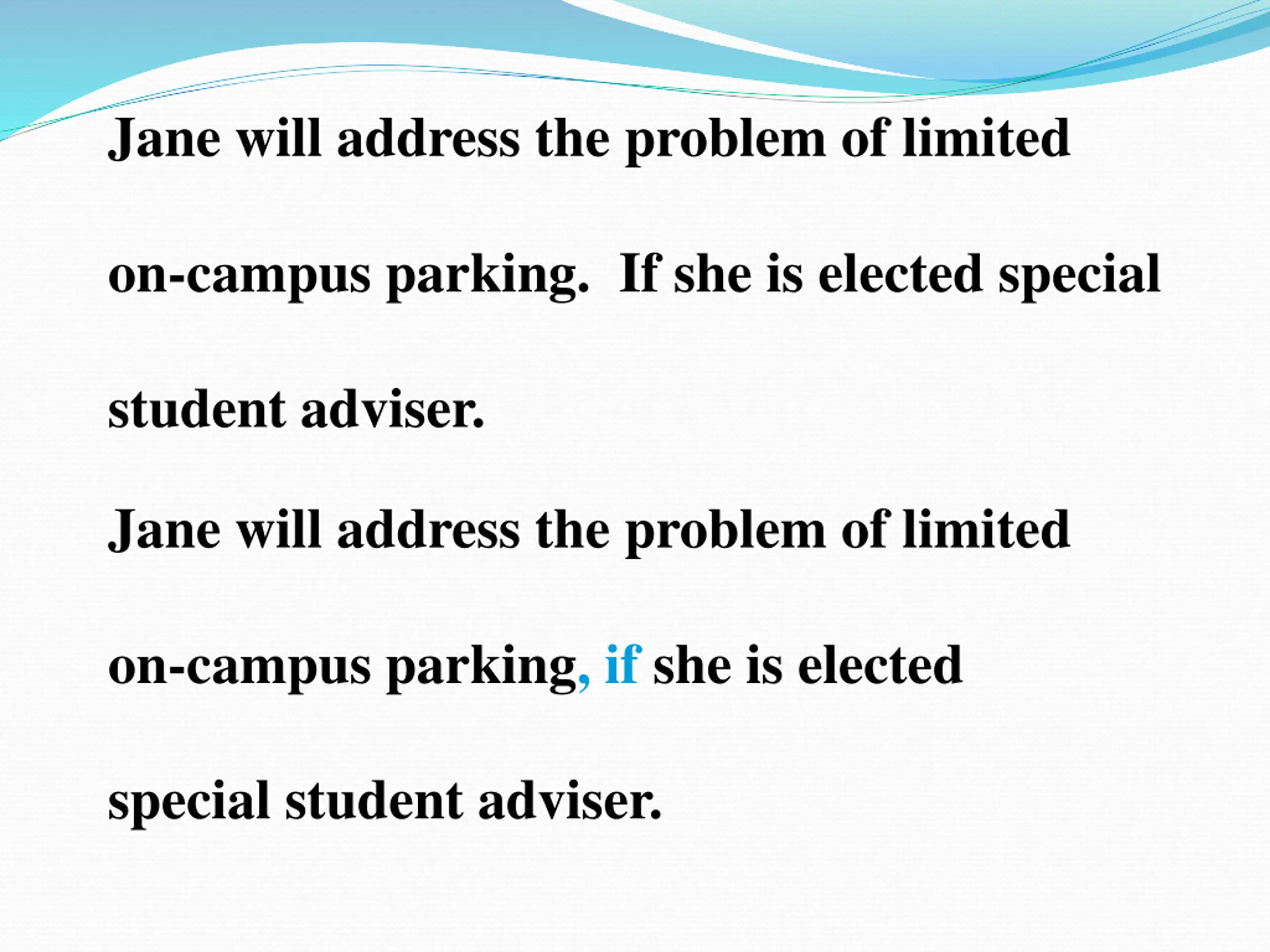 Jane will address the problem of limited on-campus parking. If she is elected special student adviser. Jane will address the problem of limited on-campus parking, if she is elected special student adviser.