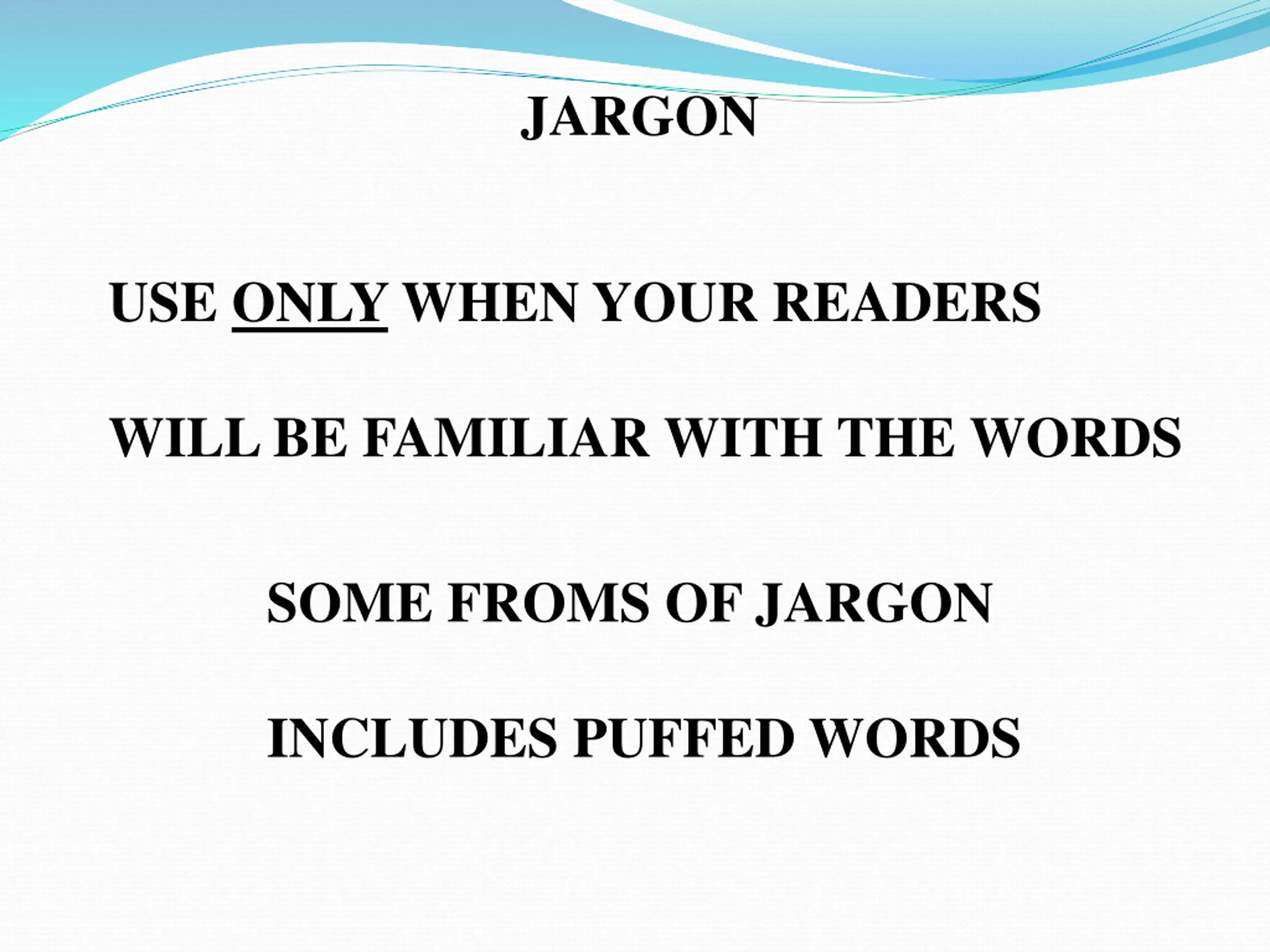 JARGON USE ONLY WHEN YOUR READERS WILL BE FAMILIAR WITH THE WORDS SOME FROMS OF JARGON INCLUDES PUFFED WORDS