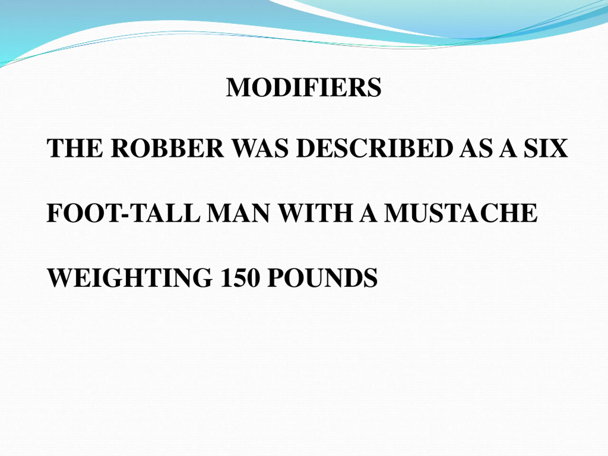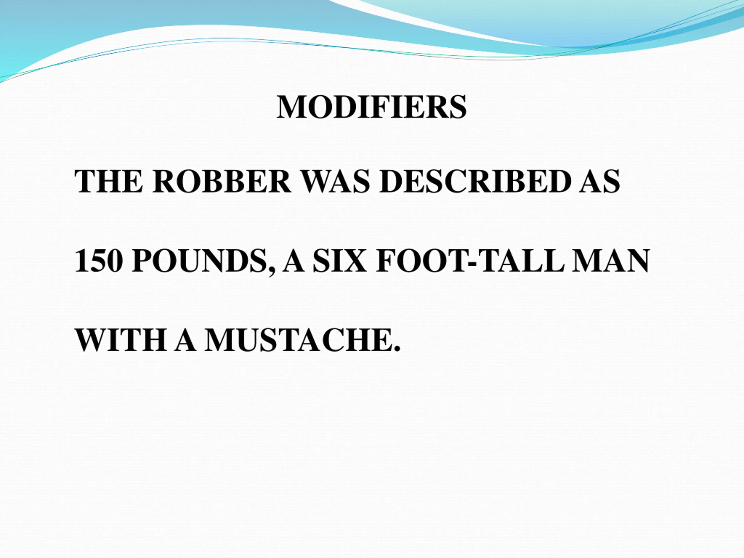 MODIFIERS THE ROBBER WAS DESCRIBED AS A SIX FOOT-TALL MAN WITH A MUSTACHE WEIGHTING 150 POUNDS