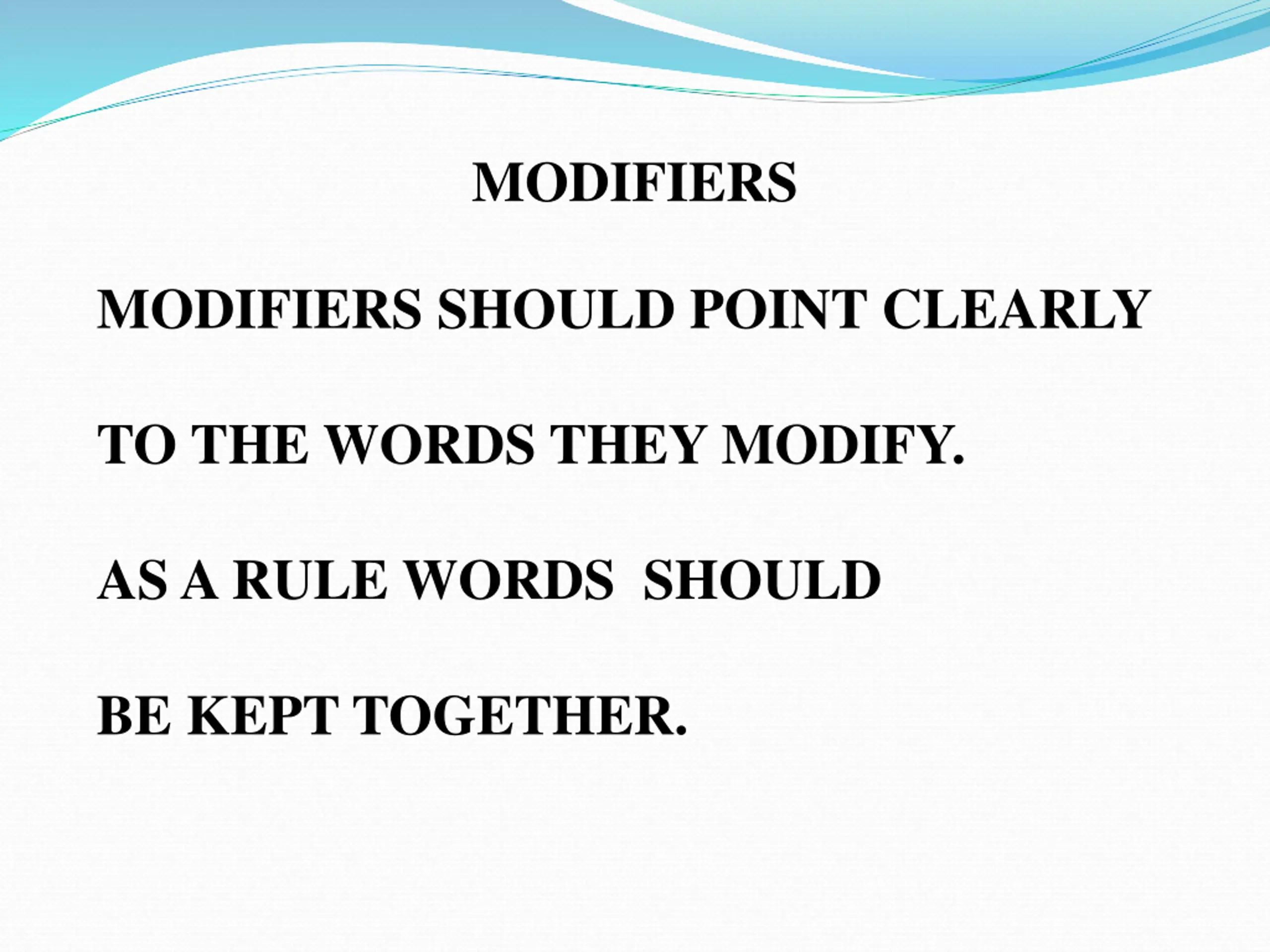 MODIFIERS MODIFIERS SHOULD POINT CLEARLY TO THE WORDS THEY MODIFY. AS A RULE WORDS SHOULD BE KEPT TOGETHER.