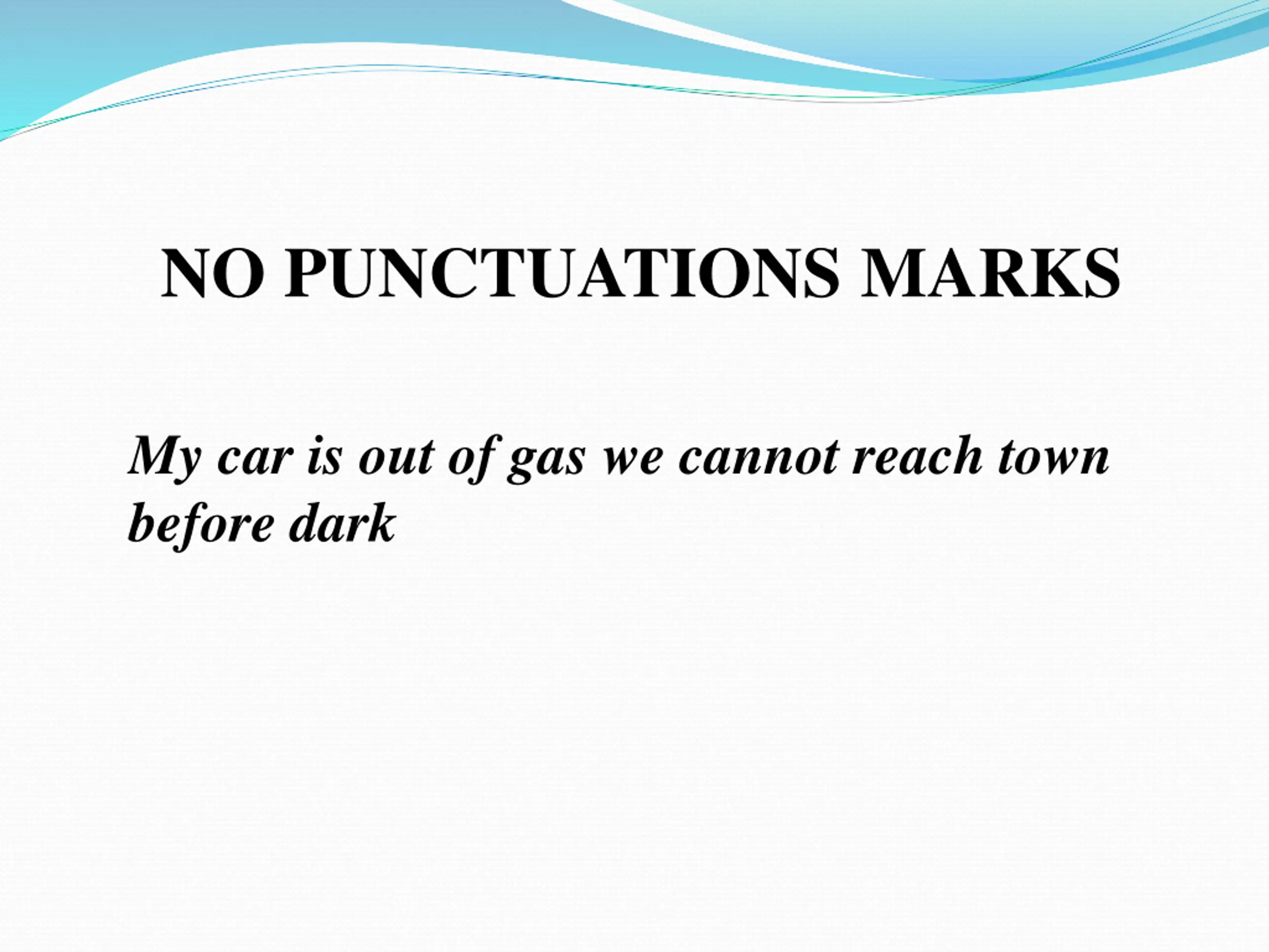NO PUNCTUATIONS MARKS My car is out of gas we cannot reach town before dark