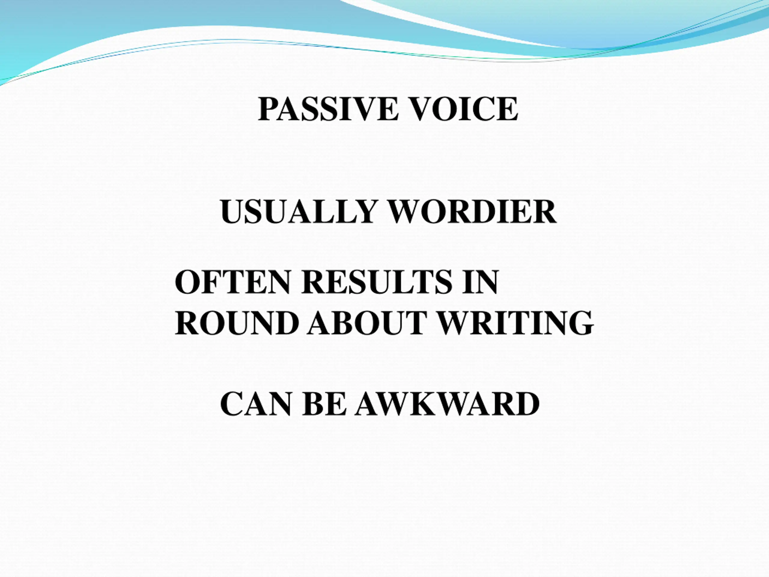 PASSIVE VOICE USUALLY WORDIER OFTEN RESULTS IN ROUND ABOUT WRITING CAN BE AWKWARD