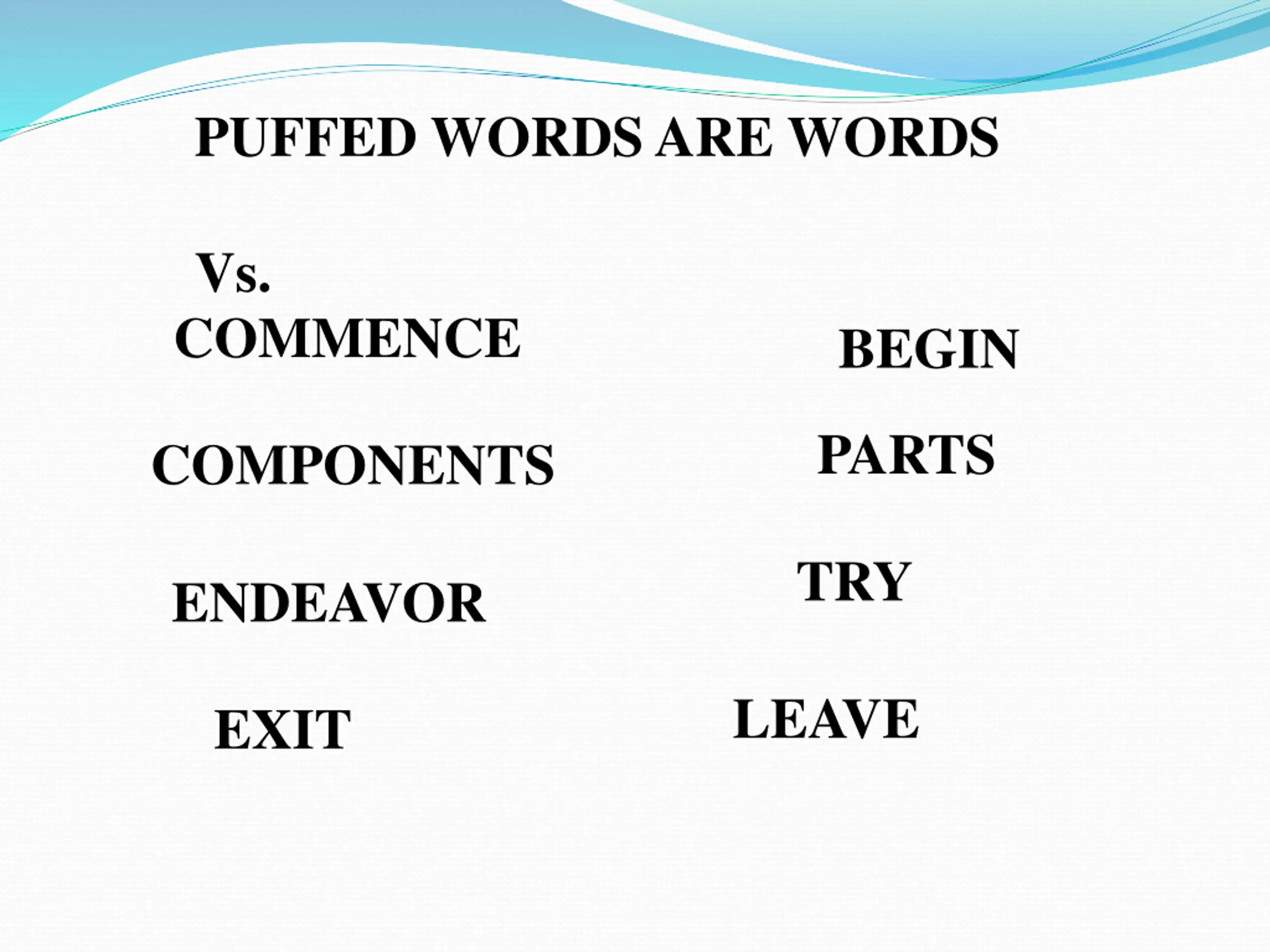 PUFFED WORDS ARE WORDS Vs. COMMENCE BEGIN PARTS COMPONENTS TRY ENDEAVOR LEAVE EXIT