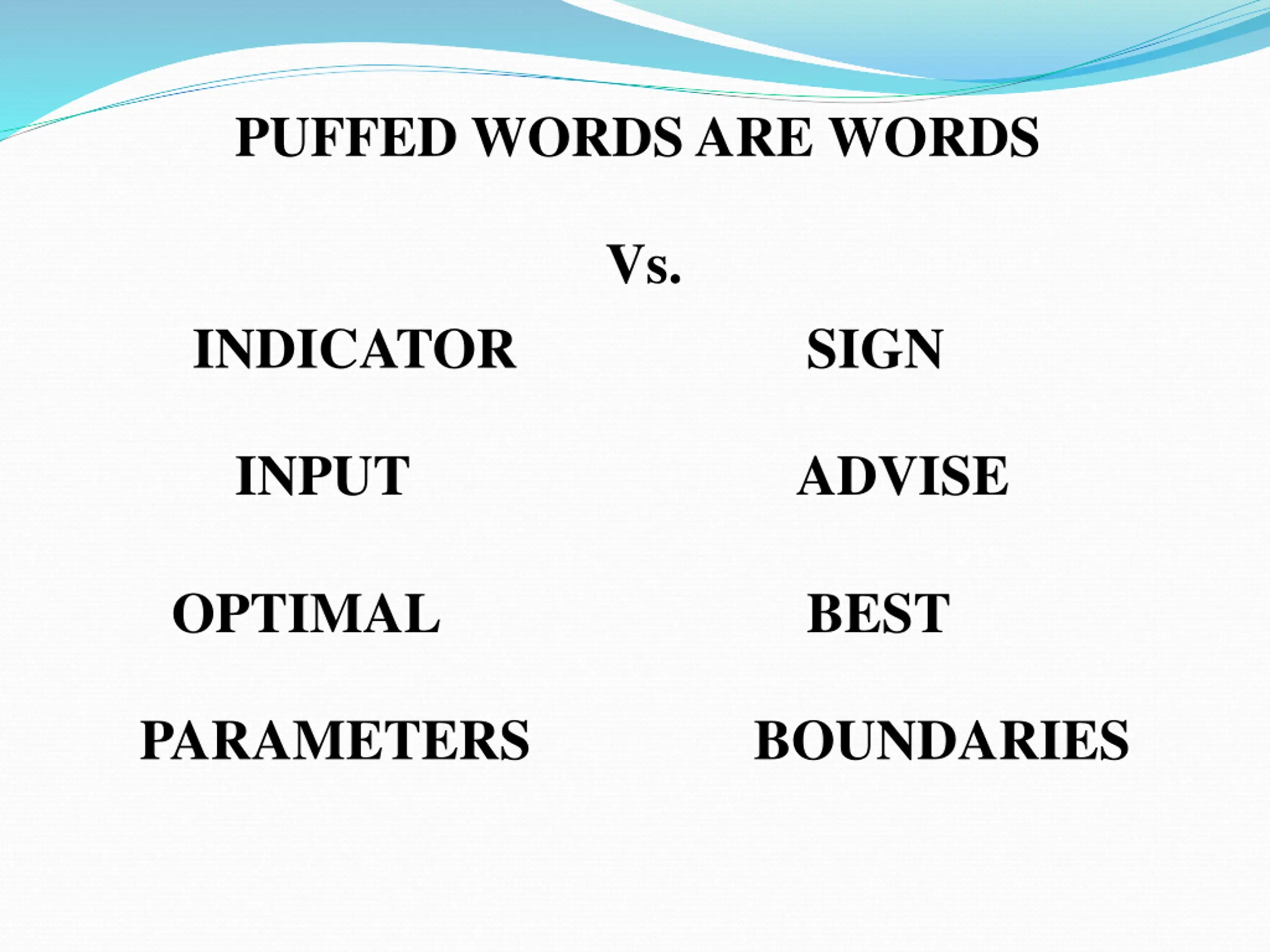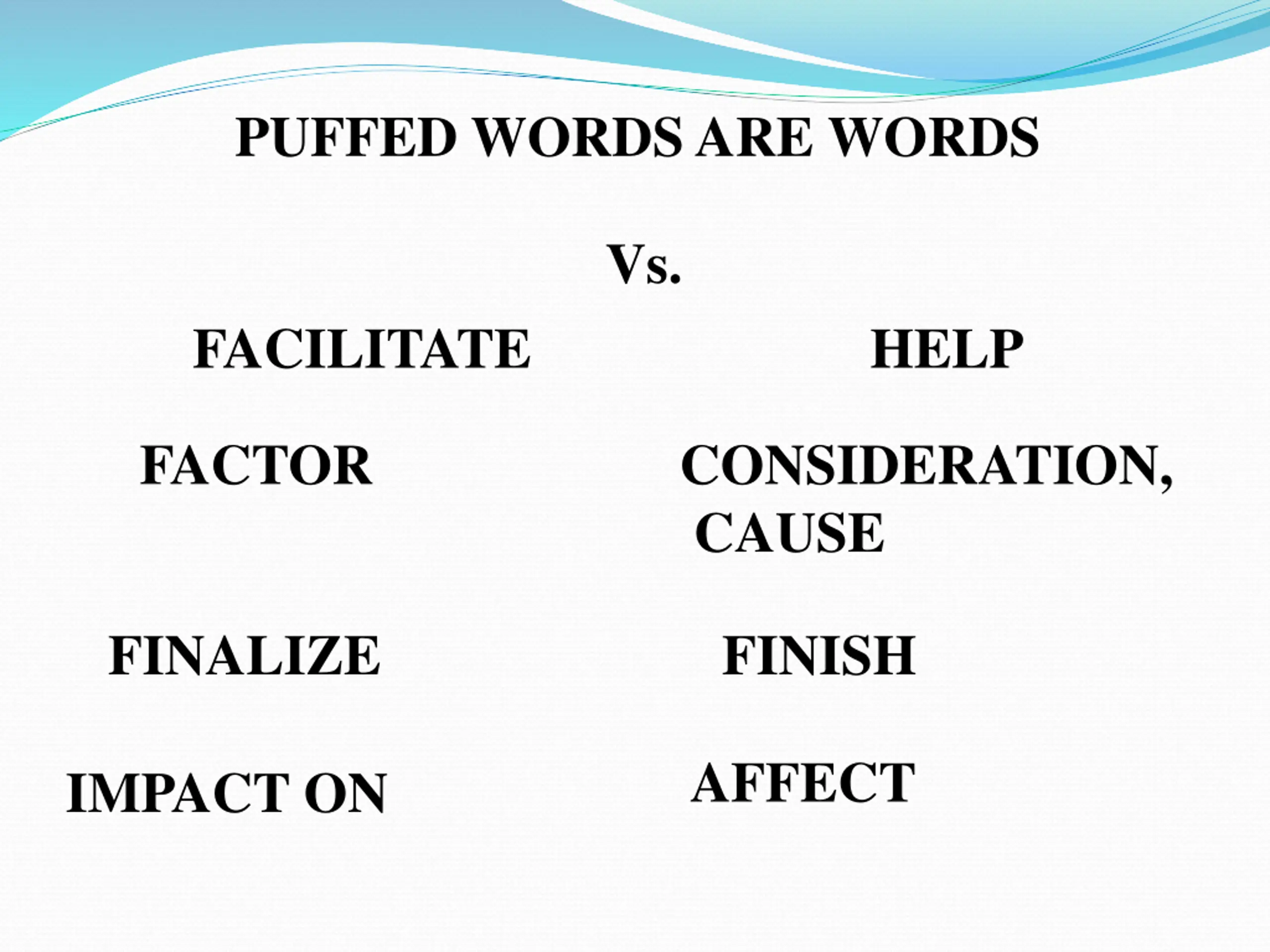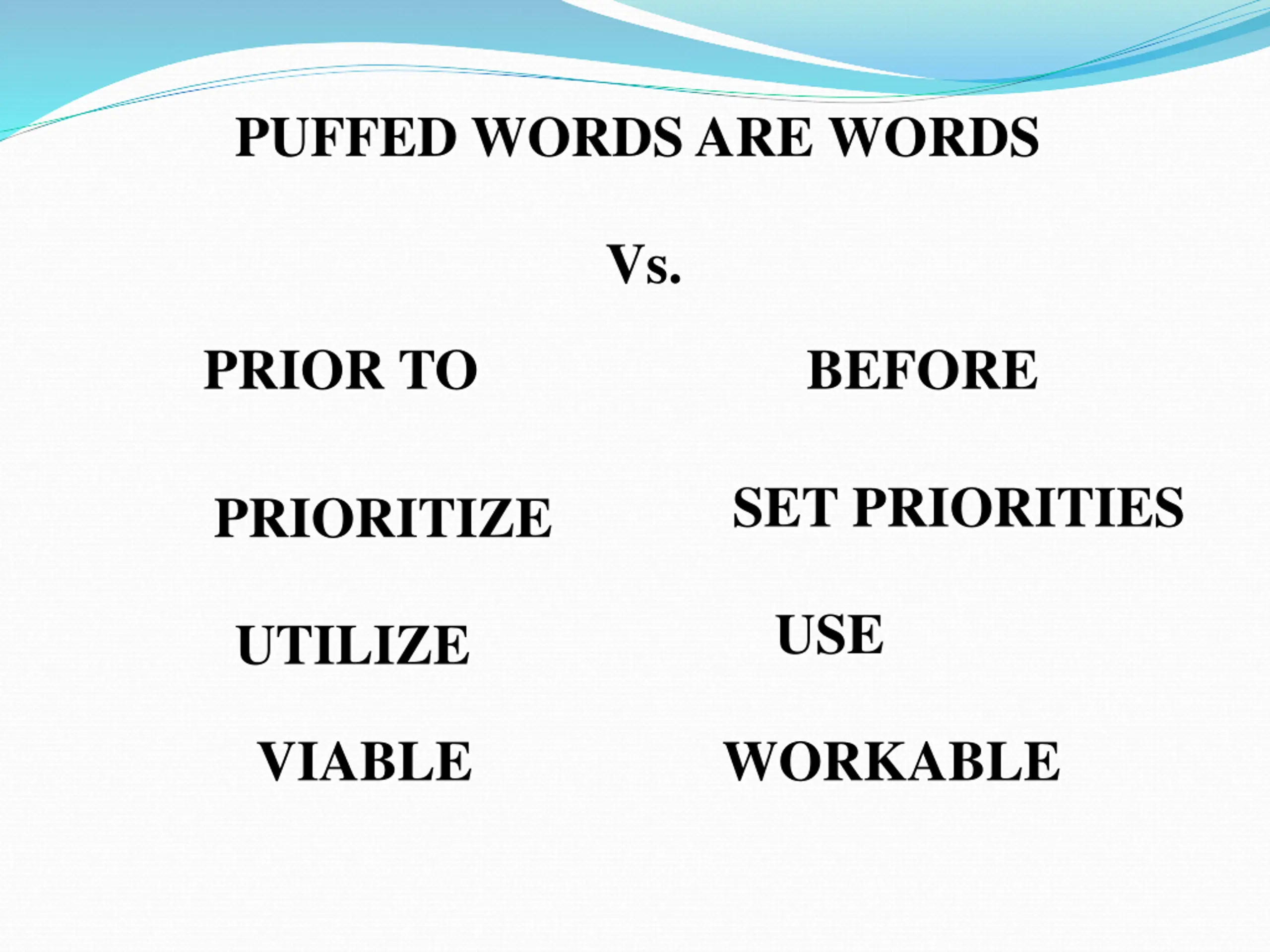 PUFFED WORDS ARE WORDS Vs. PRIOR TO BEFORE SET PRIORITIES PRIORITIZE USE UTILIZE VIABLE WORKABLE