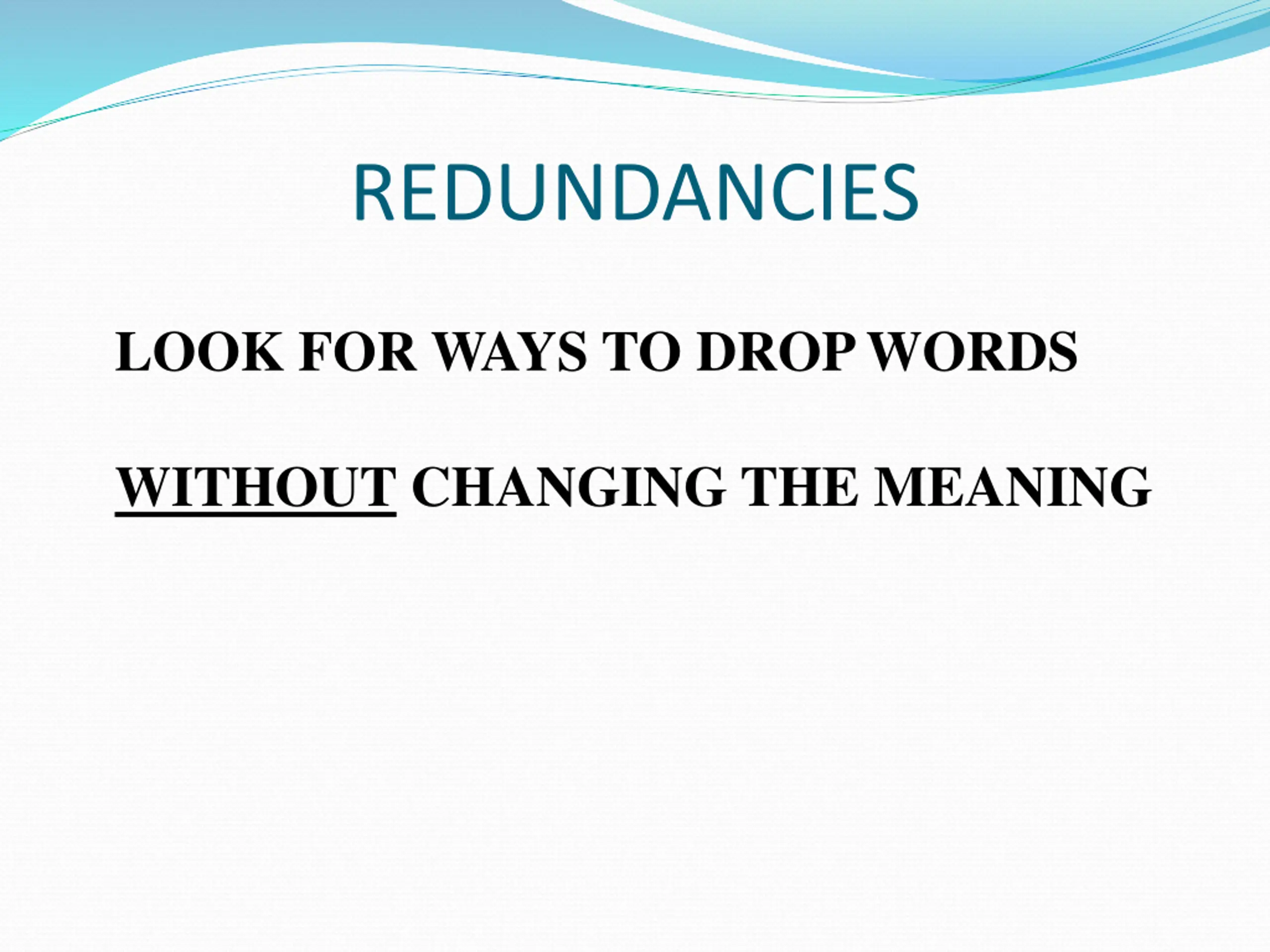 REDUNDANCIES LOOK FOR WAYS TO DROP WORDS WITHOUT CHANGING THE MEANING