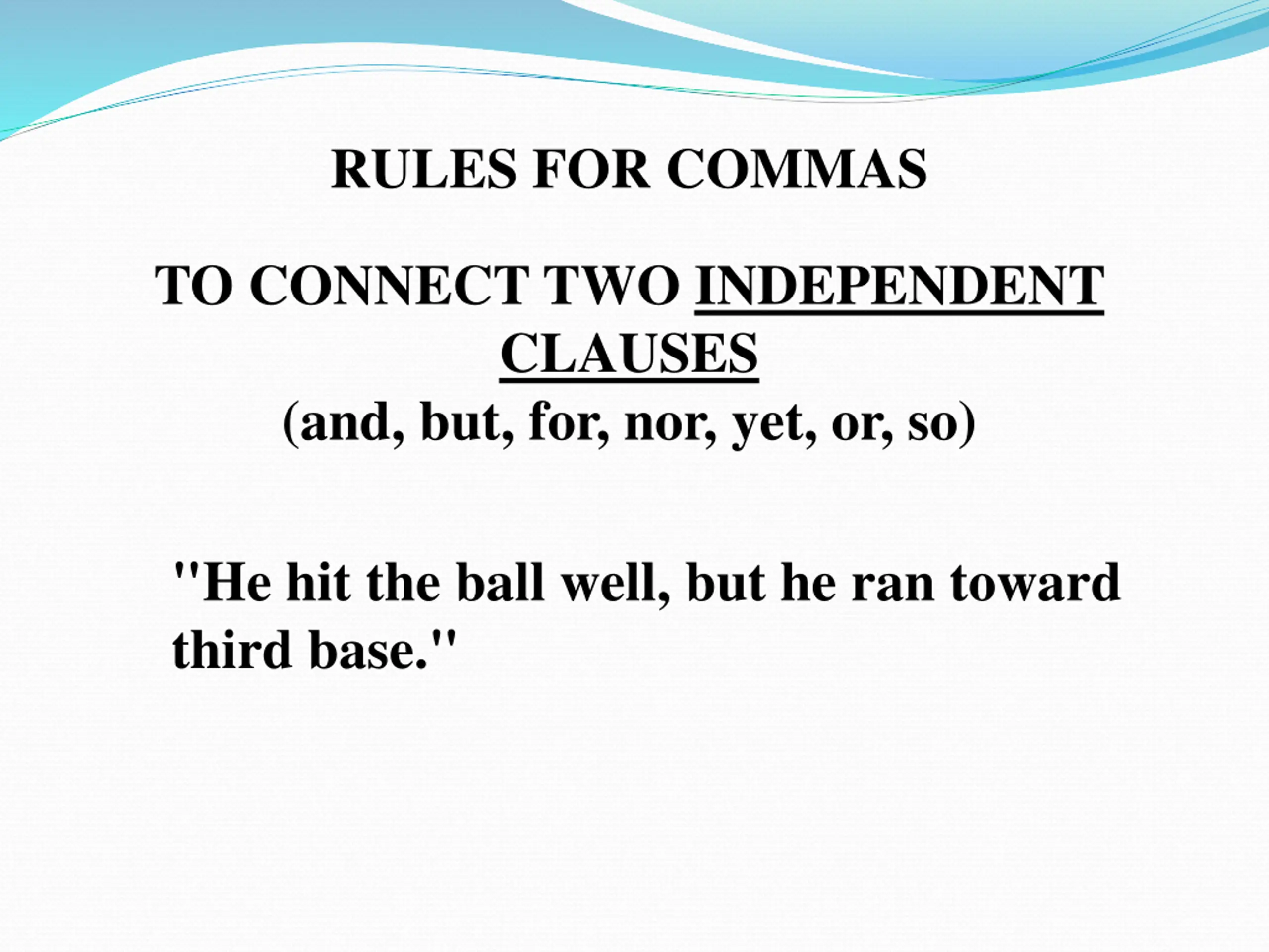 RULES FOR COMMAS TO CONNECT TWO INDEPENDENT CLAUSES (and, but, for, nor, yet, or, so) "He hit the ball well, but he ran toward third base."