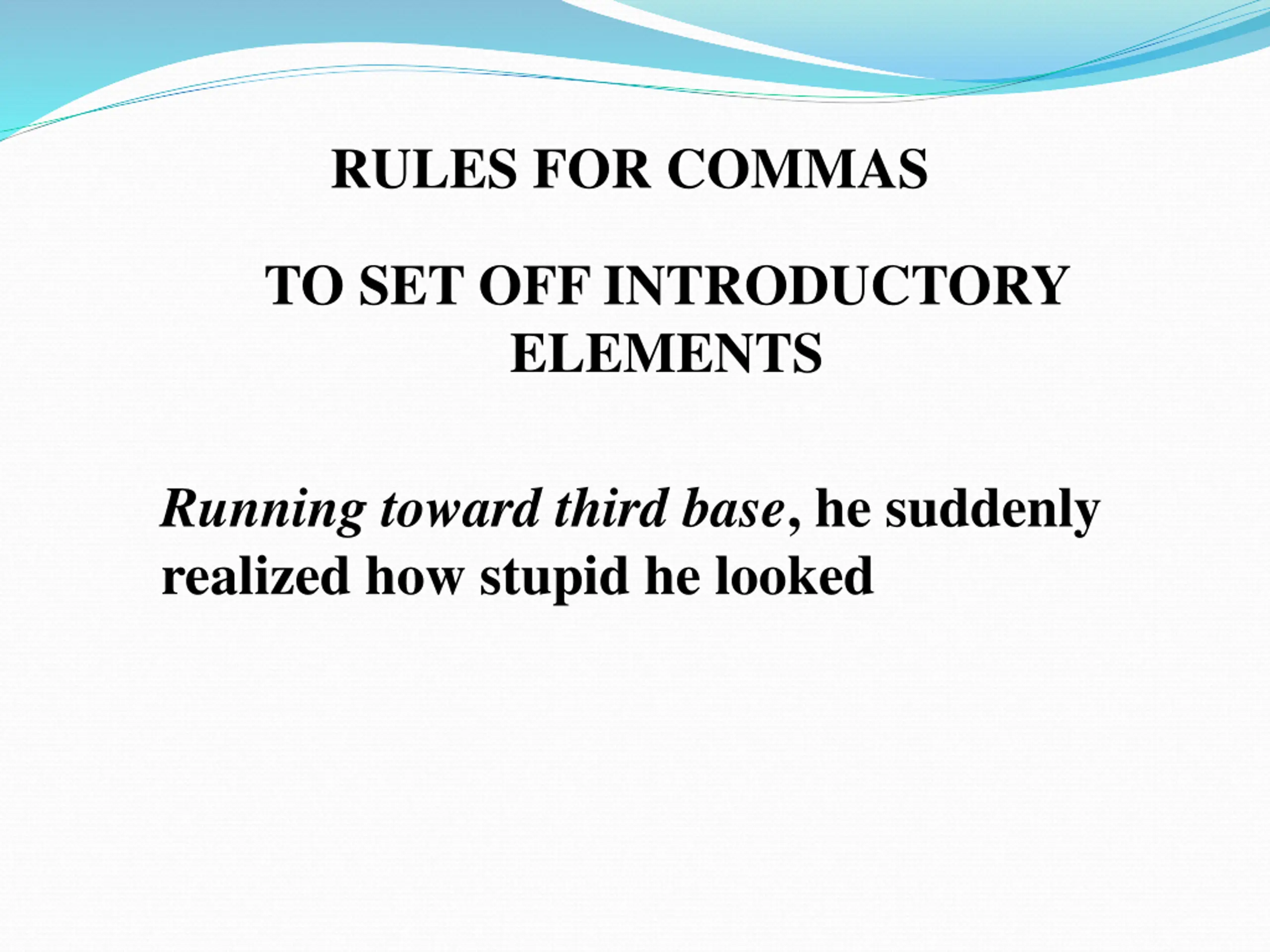RULES FOR COMMAS TO SET OFF INTRODUCTORY ELEMENTS Running toward third base, he suddenly realized how stupid he looked