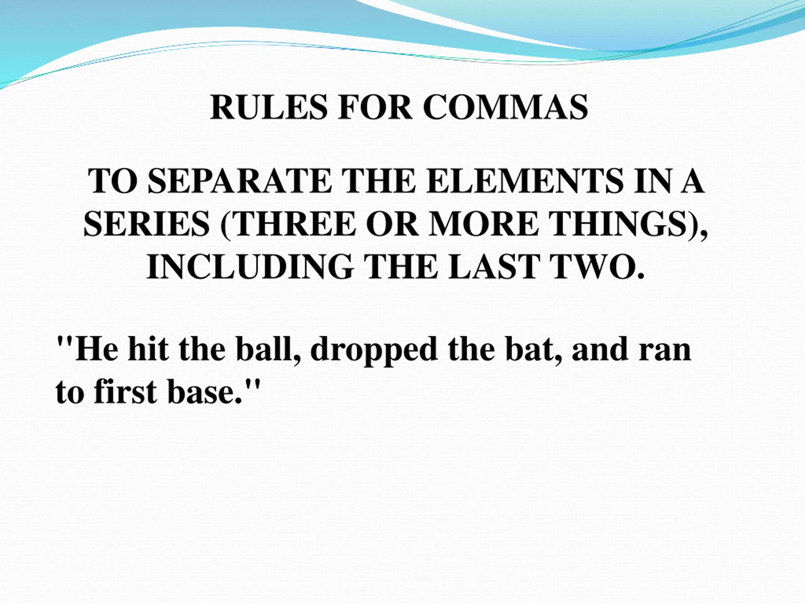 RULES FOR COMMAS TO SEPARATE THE ELEMENTS IN A SERIES (THREE OR MORE THINGS), INCLUDING THE LAST TWO. "He hit the ball, dropped the bat, and ran to first base."