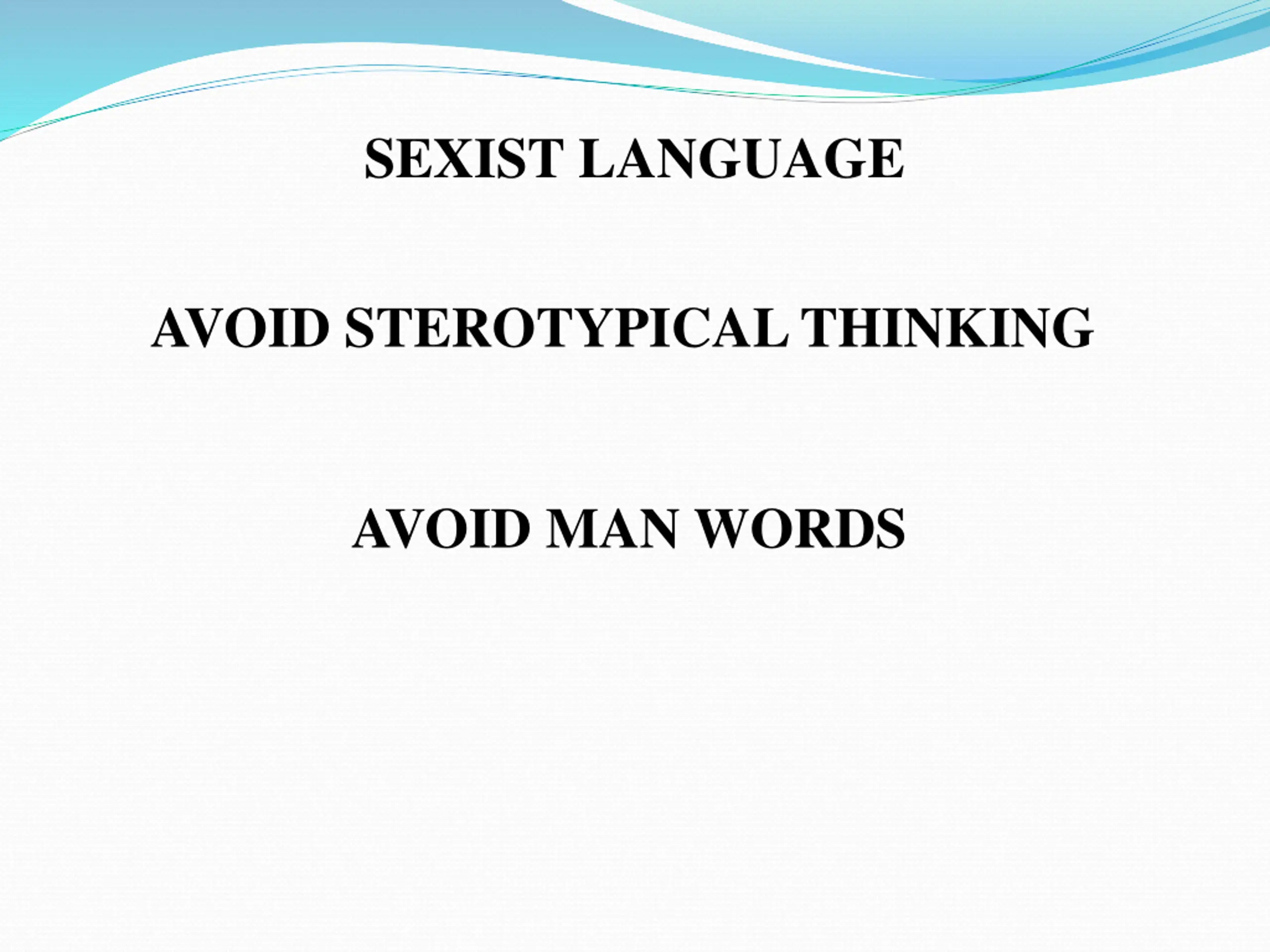 SEXIST LANGUAGE AVOID STEROTYPICAL THINKING AVOID MAN WORDS