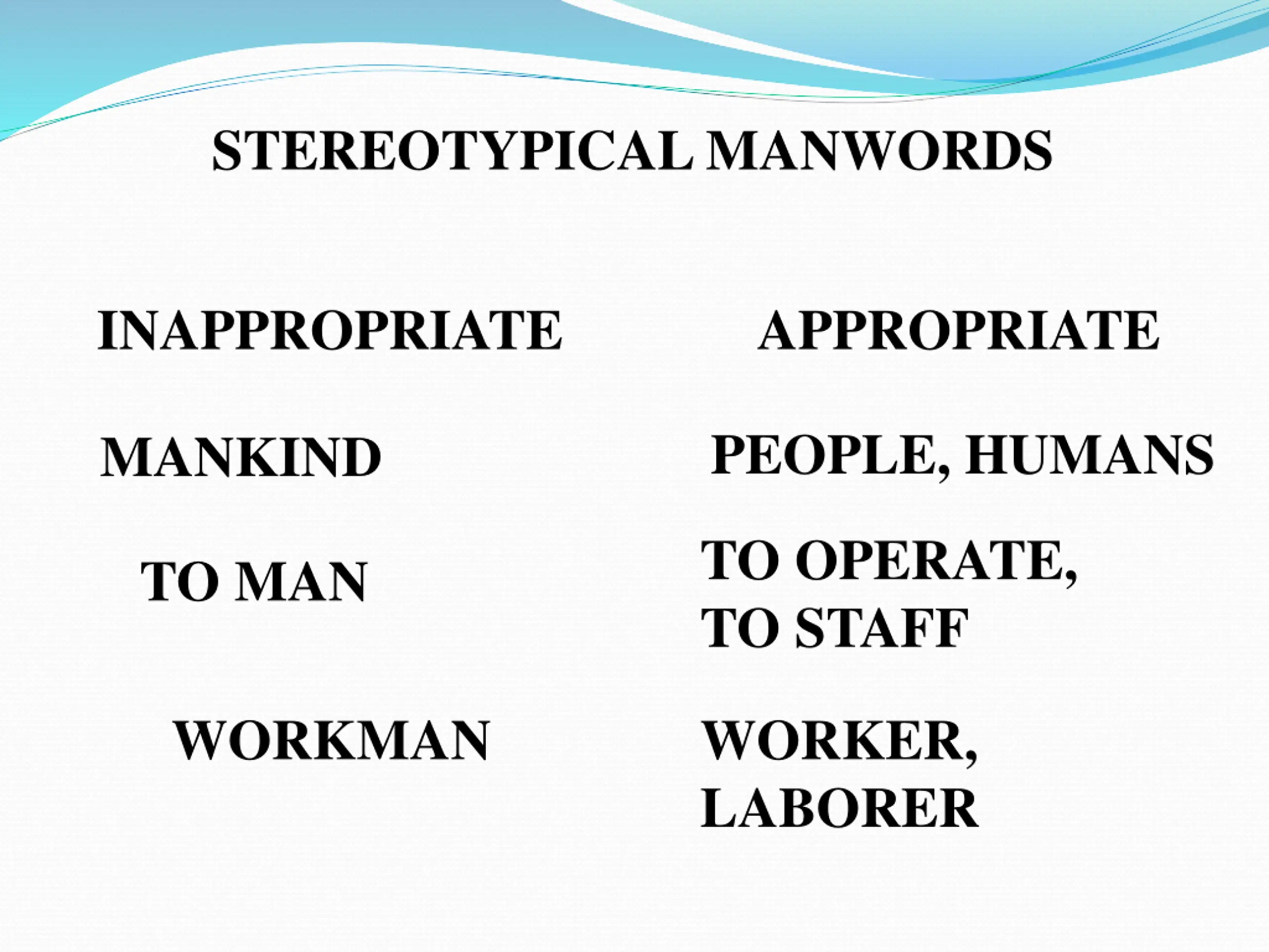 STEREOTYPICAL MANWORDS INAPPROPRIATE APPROPRIATE PEOPLE, HUMANS MANKIND TO OPERATE, TO STAFF TO MAN WORKMAN WORKER, LABORER