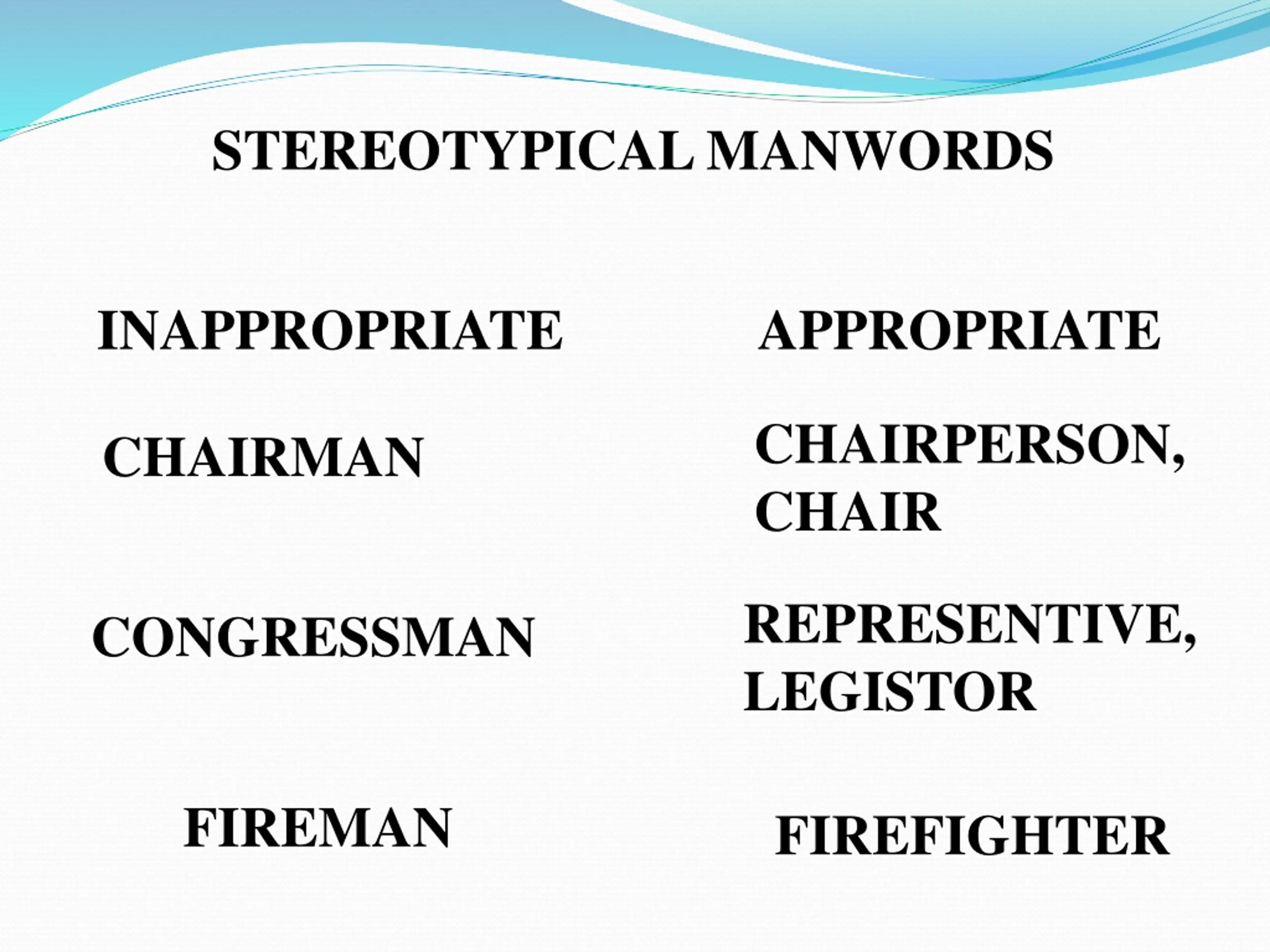 STEREOTYPICAL MANWORDS INAPPROPRIATE APPROPRIATE CHAIRPERSON, CHAIR CHAIRMAN REPRESENTIVE, LEGISTOR CONGRESSMAN FIREMAN FIREFIGHTER