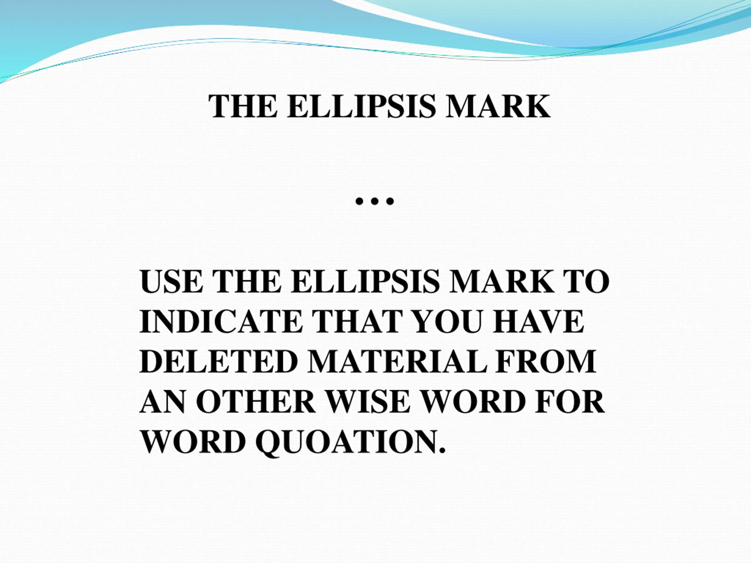 THE ELLIPSIS MARK USE THE ELLIPSIS MARK TO INDICATE THAT YOU HAVE DELETED MATERIAL FROM AN OTHER WISE WORD FOR WORD QUOATION.