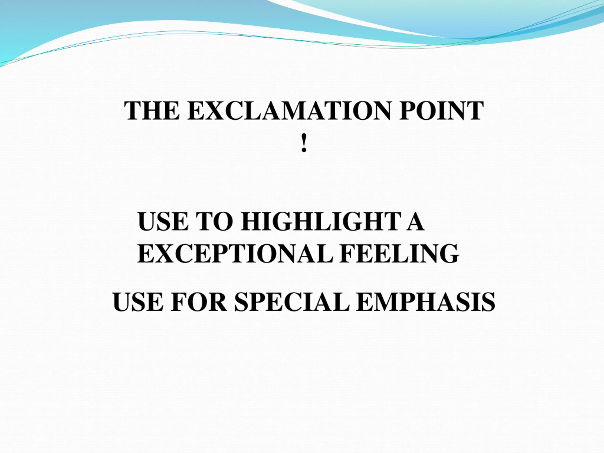 THE EXCLAMATION POINT ! USE TO HIGHLIGHT A EXCEPTIONAL FEELING USE FOR SPECIAL EMPHASIS