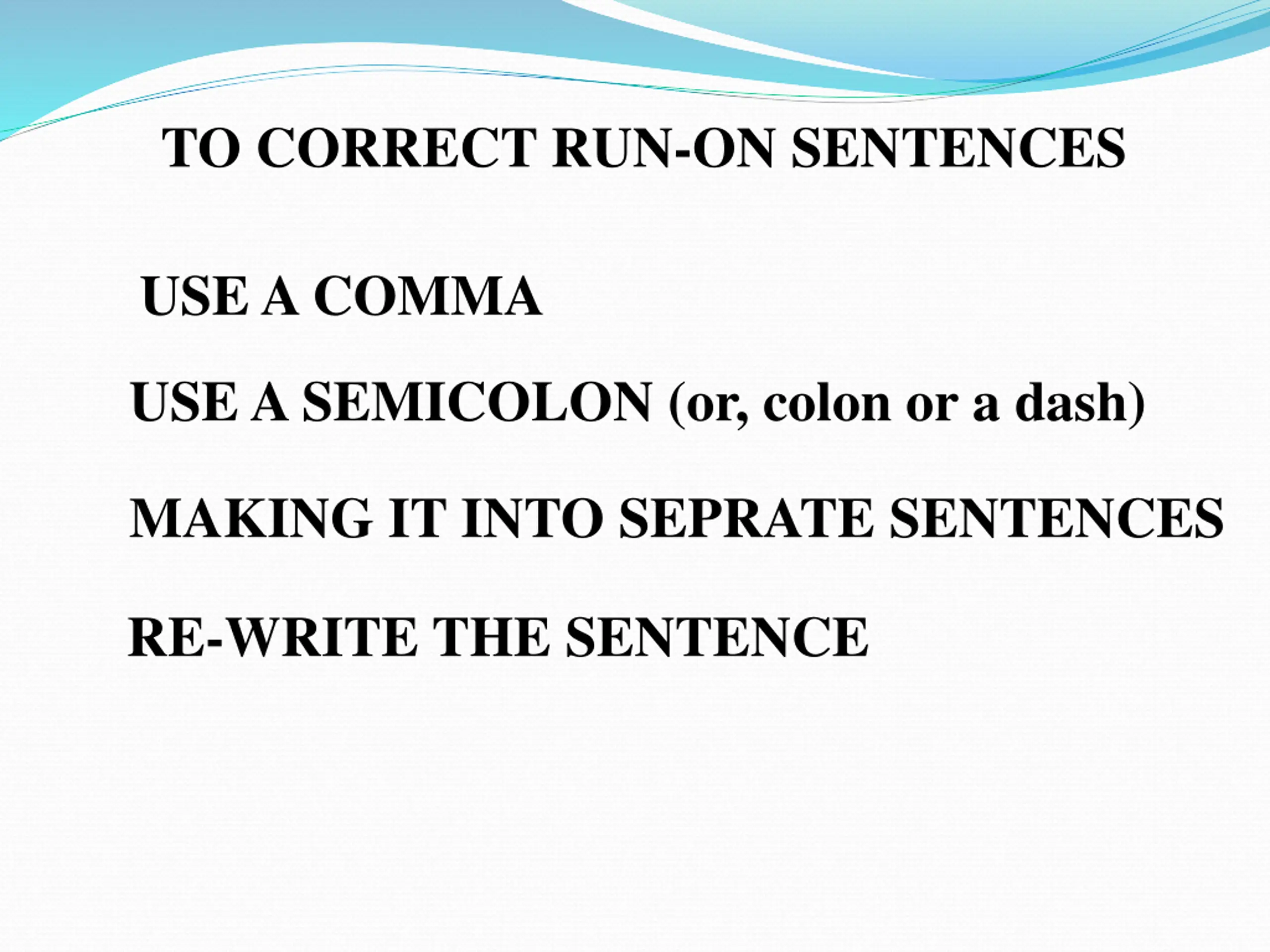 TO CORRECT RUN-ON SENTENCES USE A COMMA USE A SEMICOLON (or, colon or a dash) MAKING IT INTO SEPRATE SENTENCES RE-WRITE THE SENTENCE