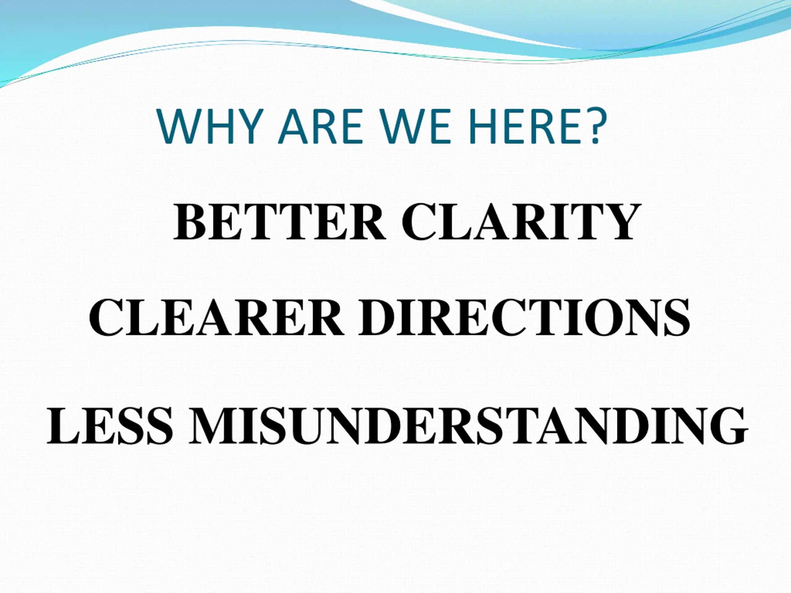 WHY ARE WE HERE? BETTER CLARITY CLEARER DIRECTIONS LESS MISUNDERSTANDING