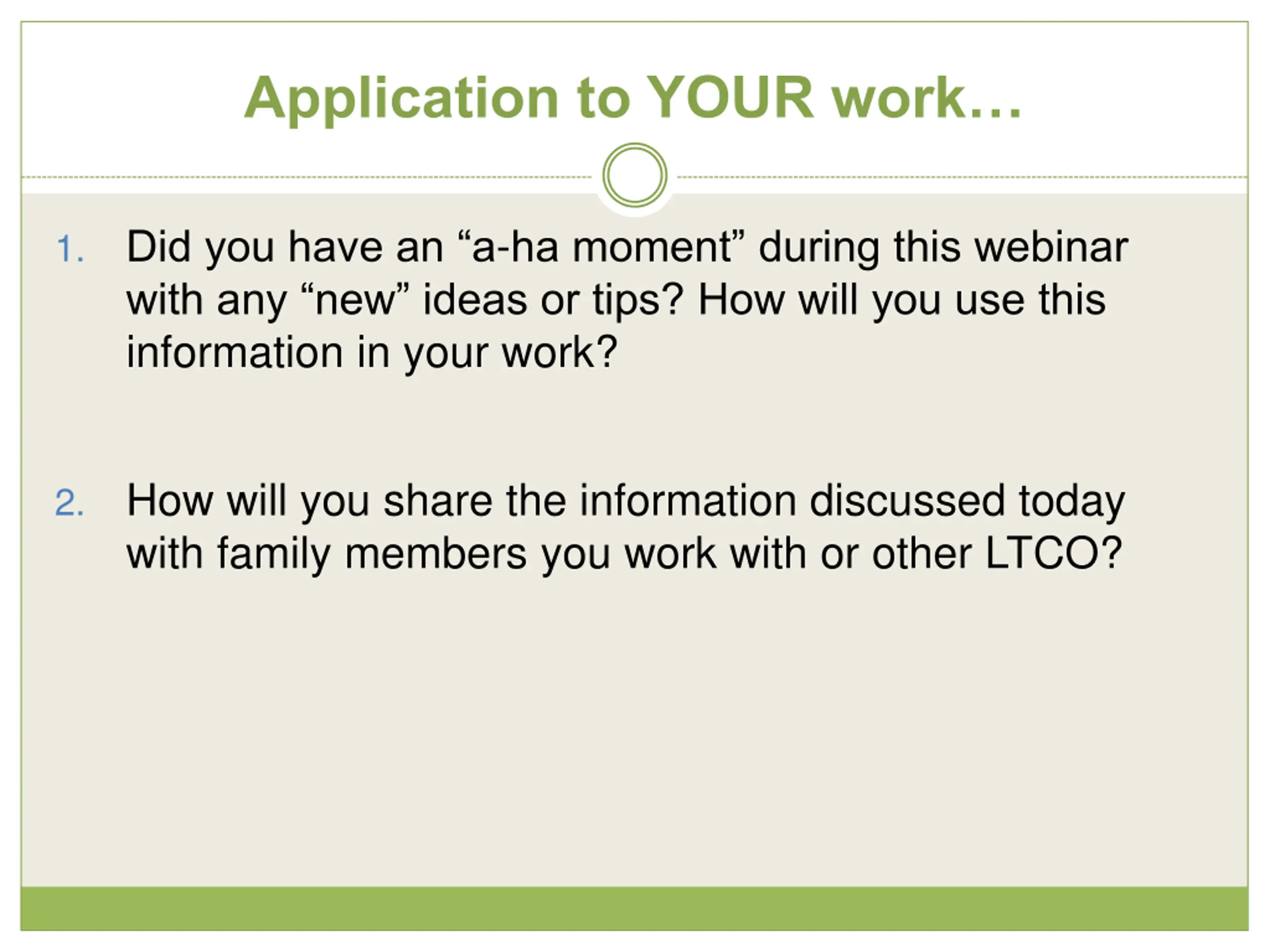 Application to YOUR work Did you have an a-ha moment during this webinar with any new ideas or tips? How will you use this information in your work? 1. How will you share the information discussed today with family members you work with or other LTCO? 2.