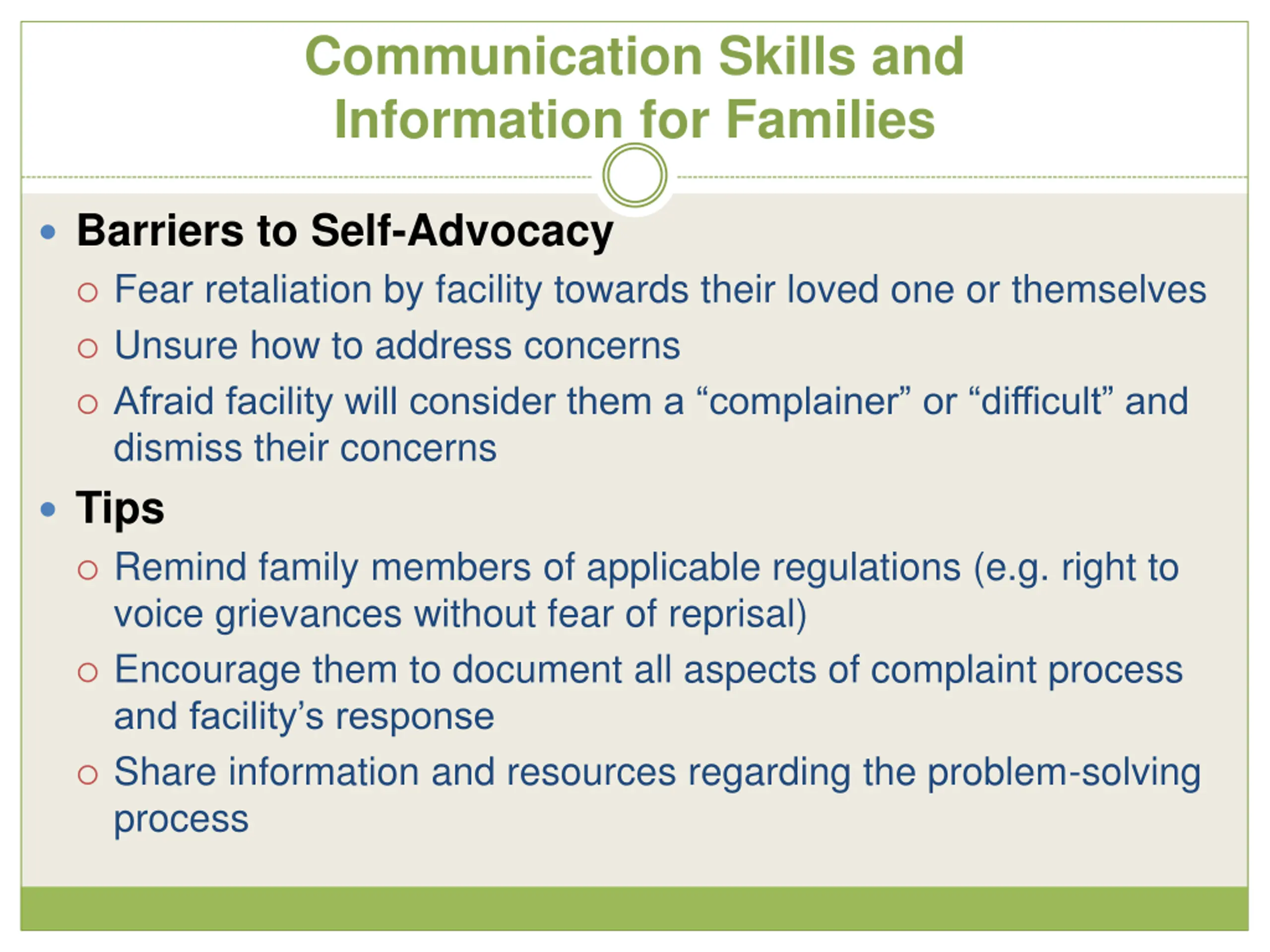 Communication Skills and Information for Families Barriers to Self-Advocacy Fear retaliation by facility towards their loved one or themselves Unsure how to address concerns Afraid facility will consider them a complainer or difficult and dismiss their concerns Tips Remind family members of applicable regulations (e.g. right to voice grievances without fear of reprisal) Encourage them to document all aspects of complaint process and facility s response Share information and resources regarding the problem-solving process