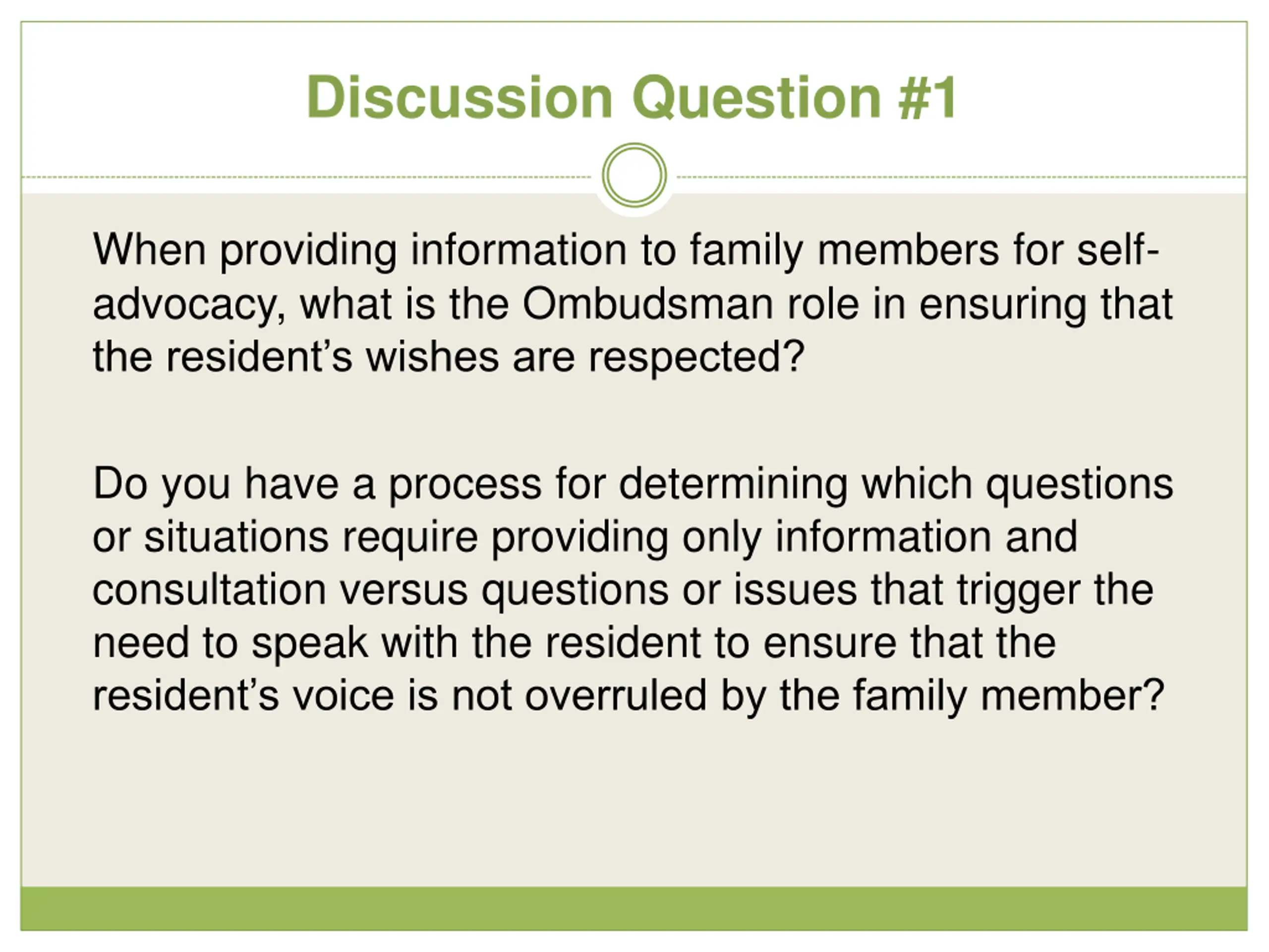 Discussion Question #1 When providing information to family members for self- advocacy, what is the Ombudsman role in ensuring that the resident s wishes are respected? Do you have a process for determining which questions or situations require providing only information and consultation versus questions or issues that trigger the need to speak with the resident to ensure that the resident s voice is not overruled by the family member?
