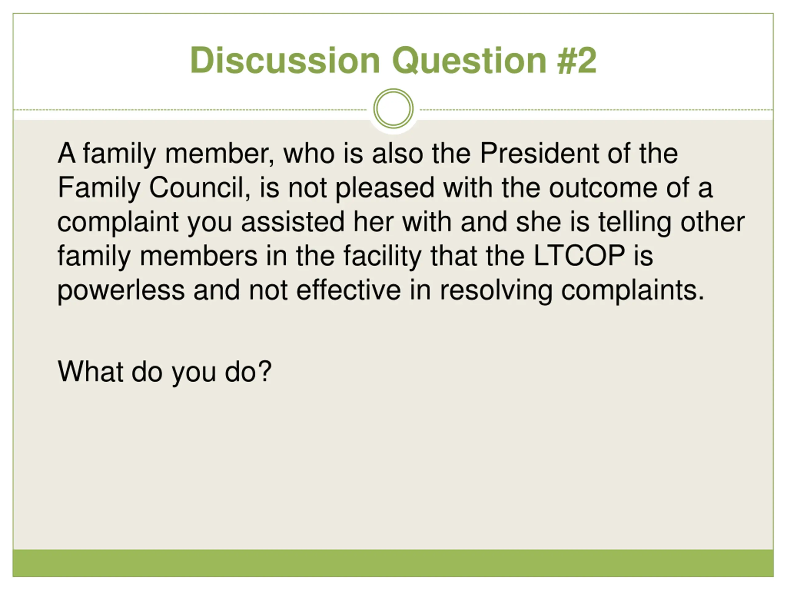 Discussion Question #2 A family member, who is also the President of the Family Council, is not pleased with the outcome of a complaint you assisted her with and she is telling other family members in the facility that the LTCOP is powerless and not effective in resolving complaints. What do you do?
