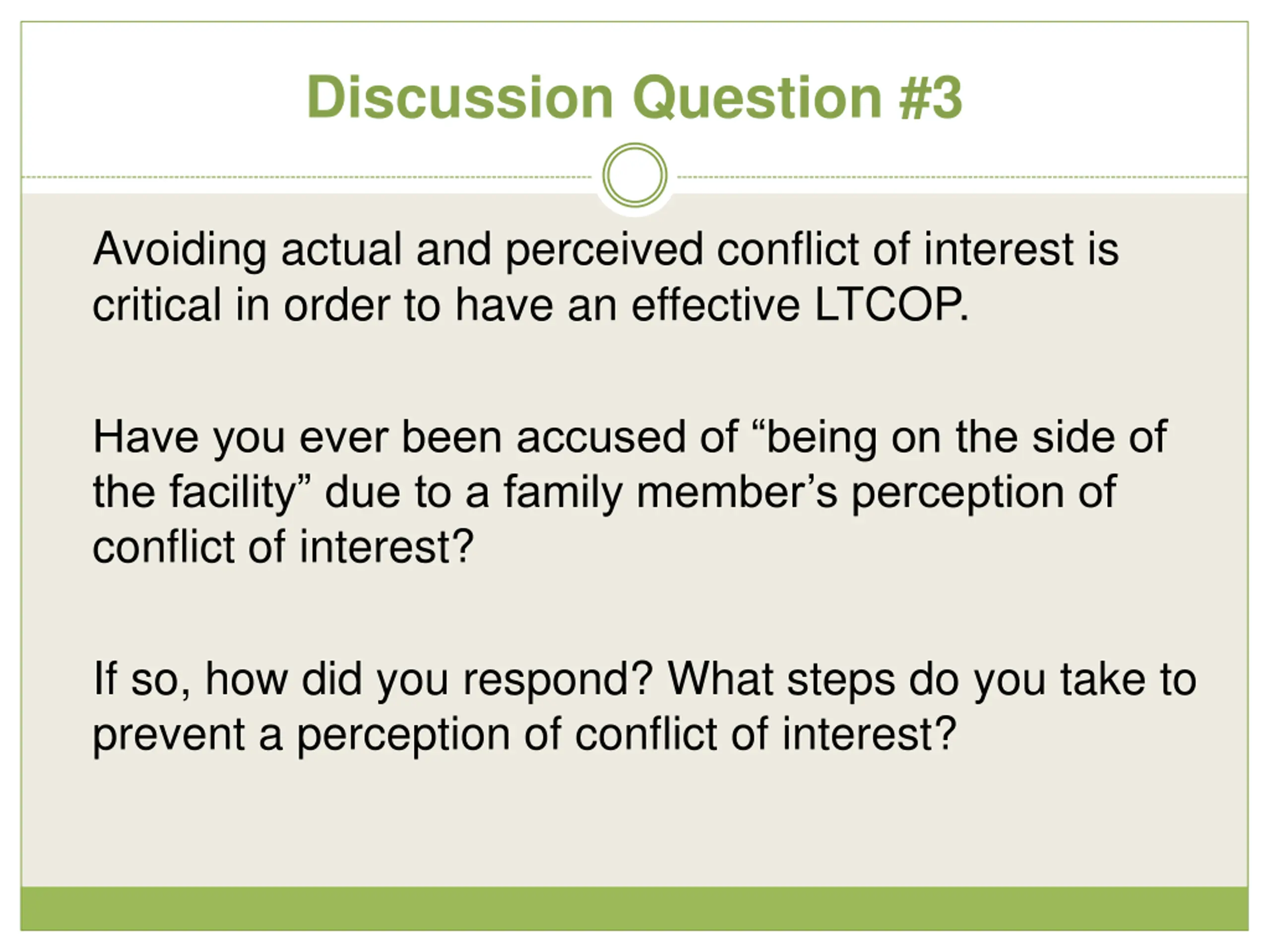 Discussion Question #3 Avoiding actual and perceived conflict of interest is critical in order to have an effective LTCOP. Have you ever been accused of being on the side of the facility due to a family member s perception of conflict of interest? If so, how did you respond? What steps do you take to prevent a perception of conflict of interest?