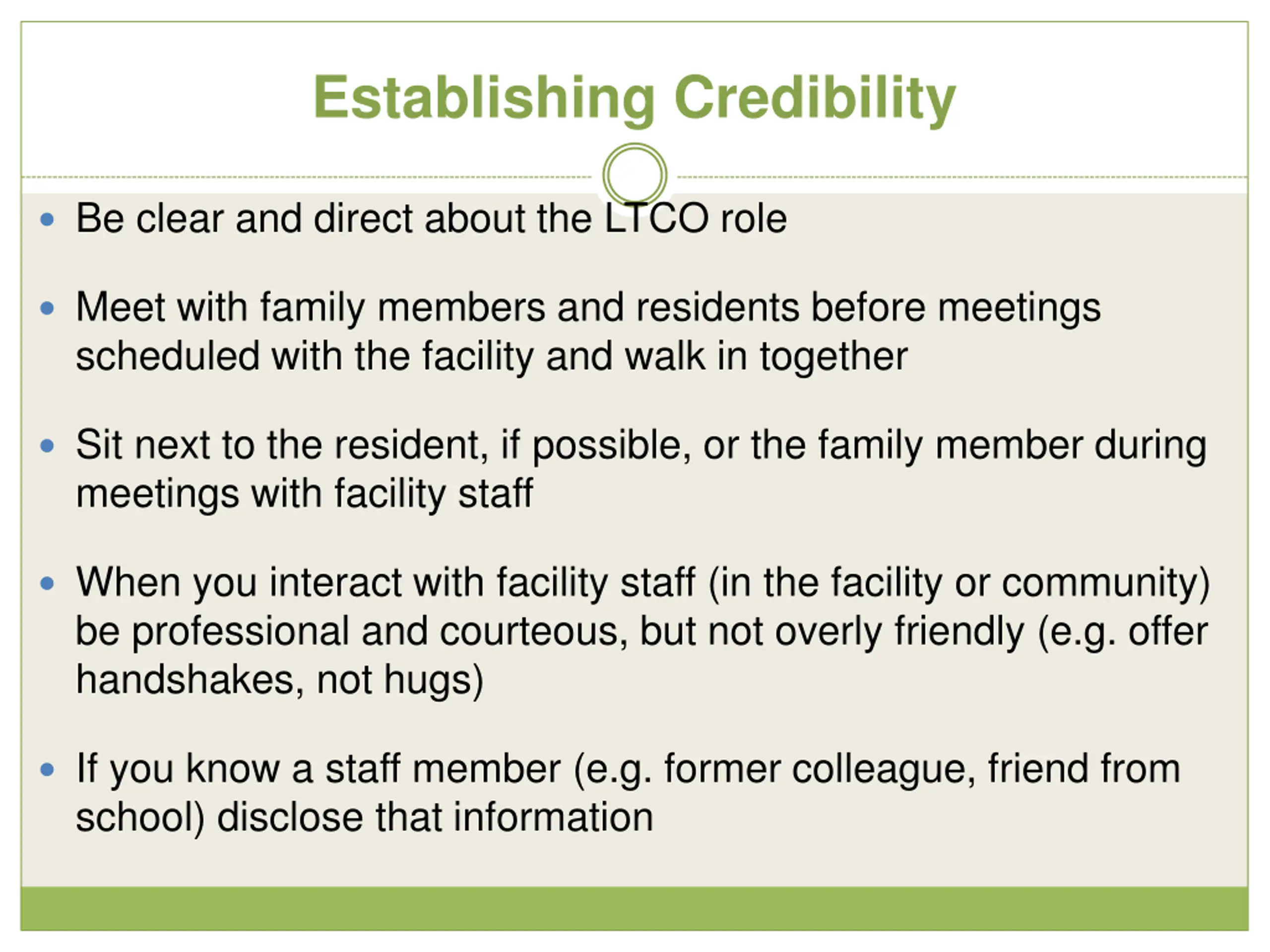 Establishing Credibility Be clear and direct about the LTCO role Meet with family members and residents before meetings scheduled with the facility and walk in together Sit next to the resident, if possible, or the family member during meetings with facility staff When you interact with facility staff (in the facility or community) be professional and courteous, but not overly friendly (e.g. offer handshakes, not hugs) If you know a staff member (e.g. former colleague, friend from school) disclose that information