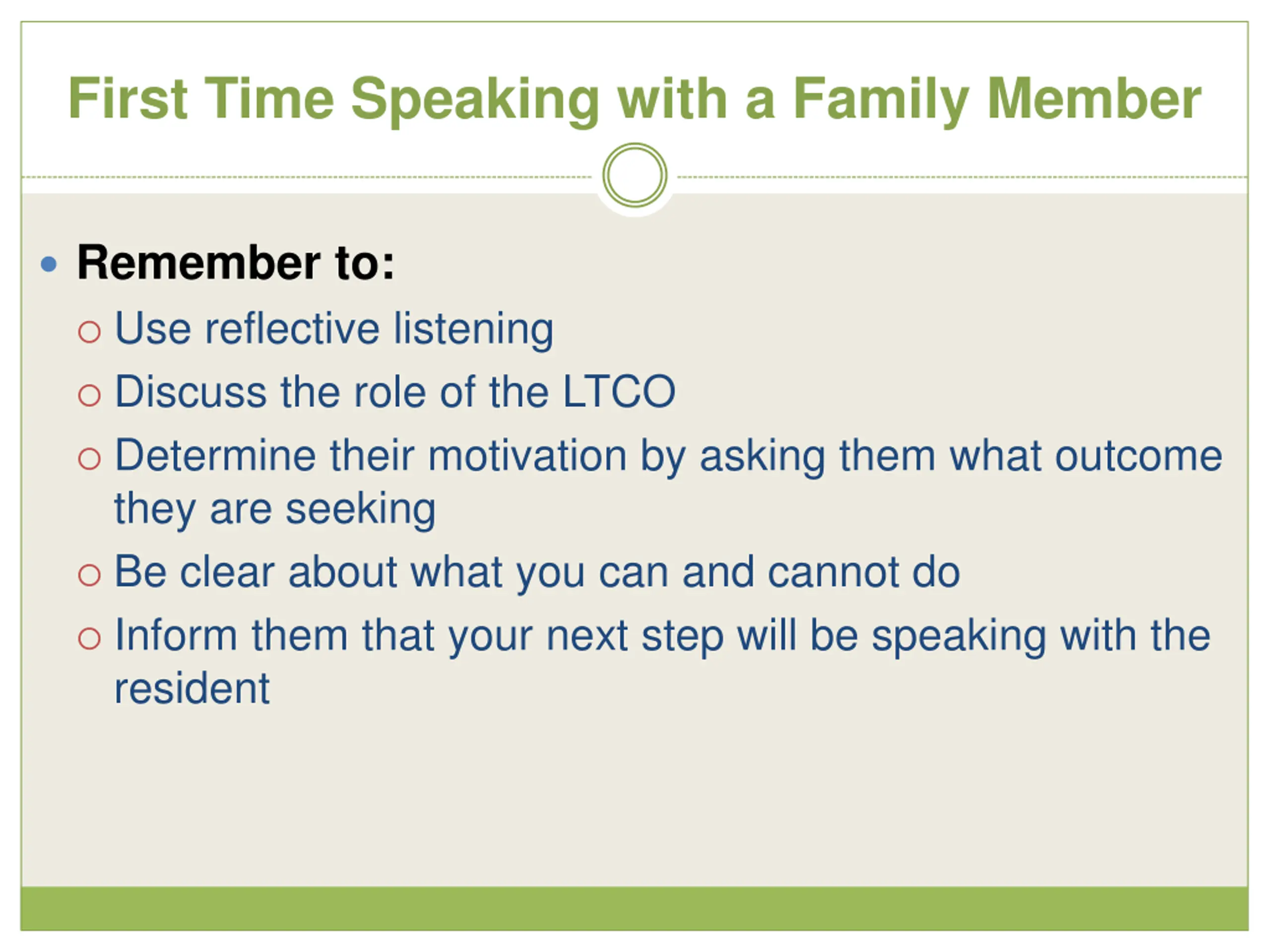 First Time Speaking with a Family Member Remember to: Use reflective listening Discuss the role of the LTCO Determine their motivation by asking them what outcome they are seeking Be clear about what you can and cannot do Inform them that your next step will be speaking with the resident