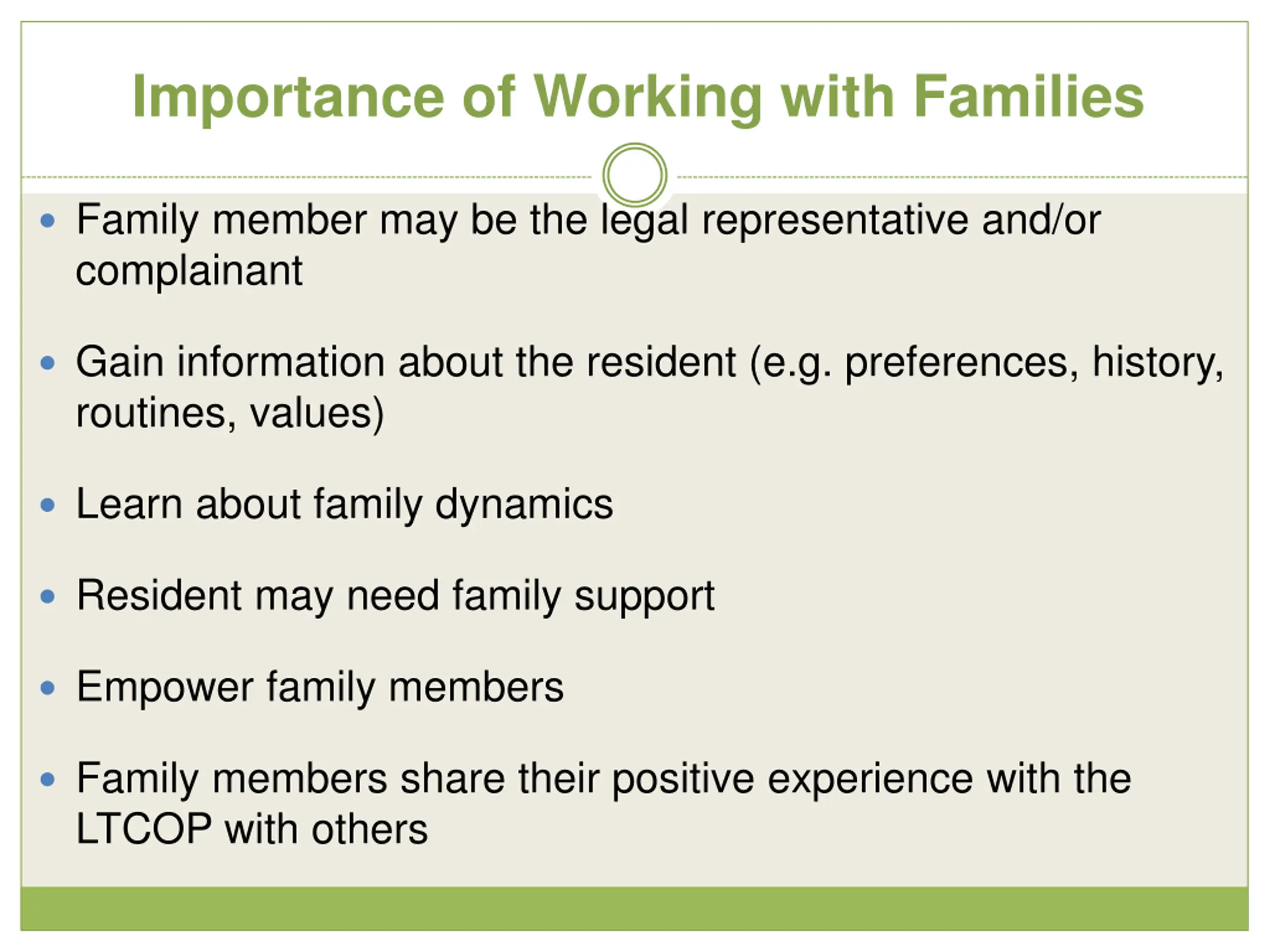 Importance of Working with Families Family member may be the legal representative and/or complainant Gain information about the resident (e.g. preferences, history, routines, values) Learn about family dynamics Resident may need family support Empower family members Family members share their positive experience with the LTCOP with others