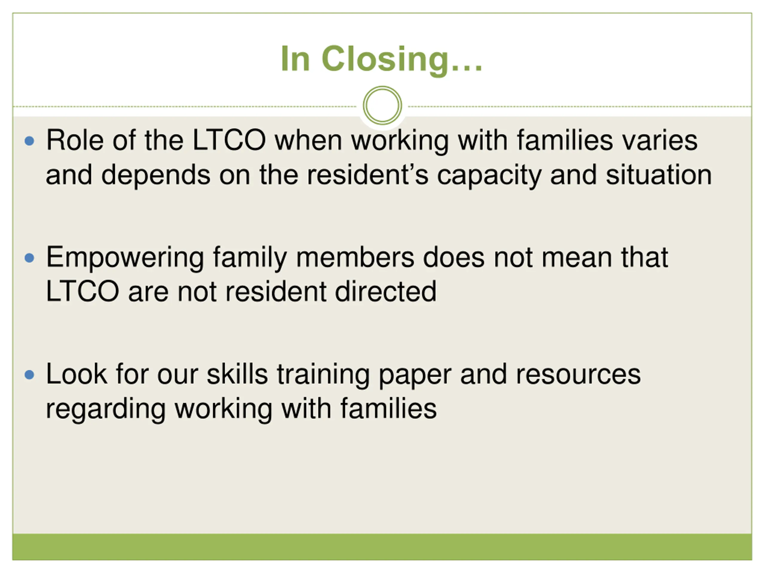 In Closing Role of the LTCO when working with families varies and depends on the resident s capacity and situation Empowering family members does not mean that LTCO are not resident directed Look for our skills training paper and resources regarding working with families