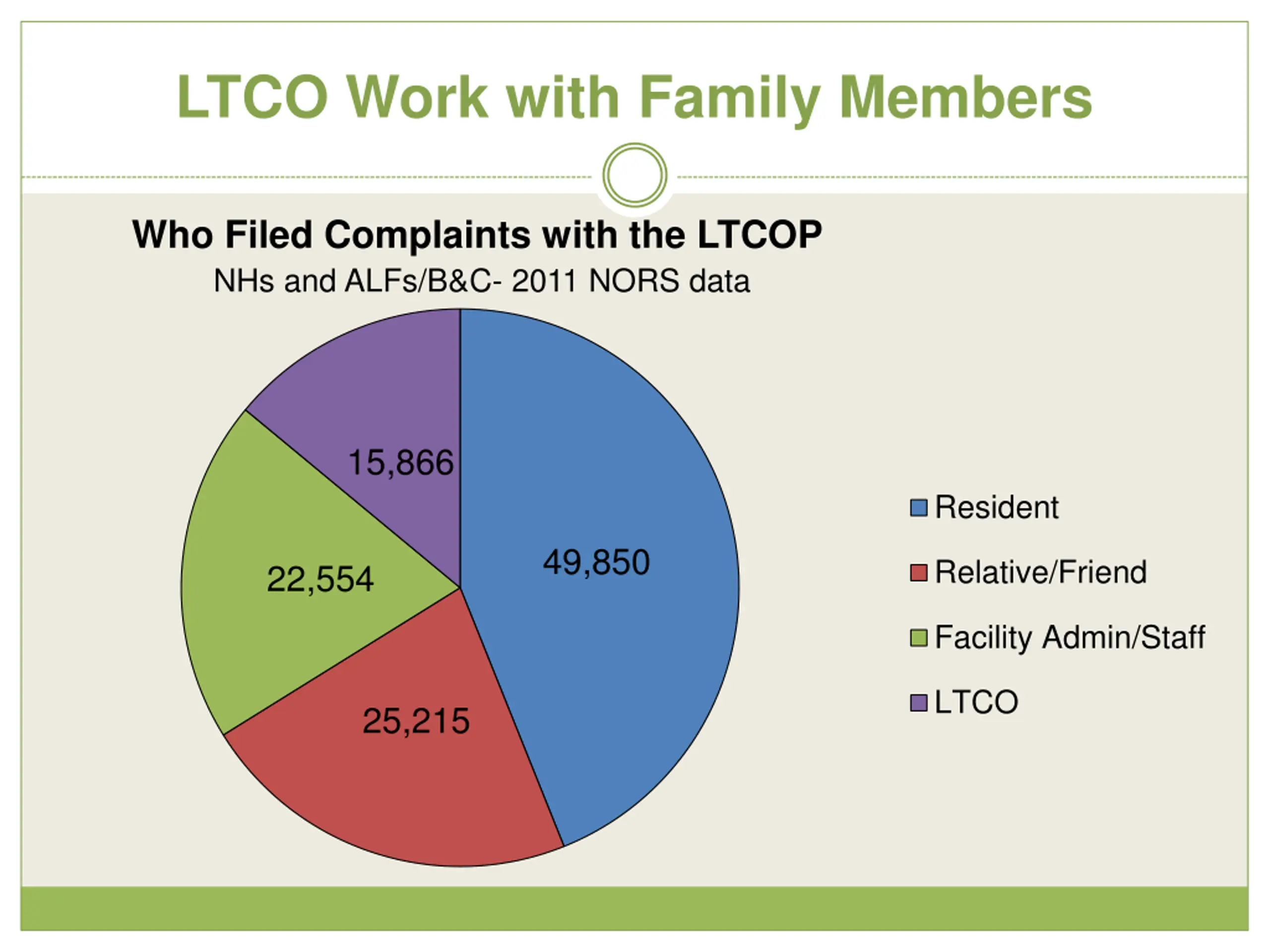 LTCO Work with Family Members Who Filed Complaints with the LTCOP NHs and ALFs/B&C- 2011 NORS data 15,866 Resident 49,850 Relative/Friend 22,554 Facility Admin/Staff LTCO 25,215