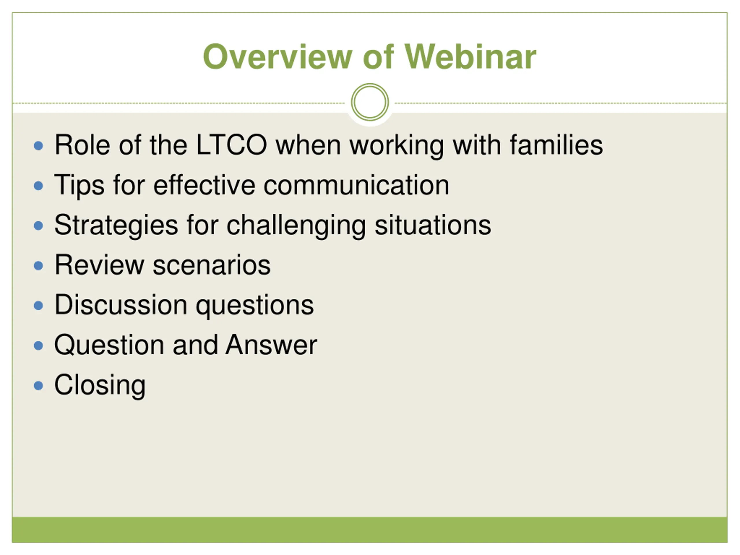 Overview of Webinar Role of the LTCO when working with families Tips for effective communication Strategies for challenging situations Review scenarios Discussion questions Question and Answer Closing