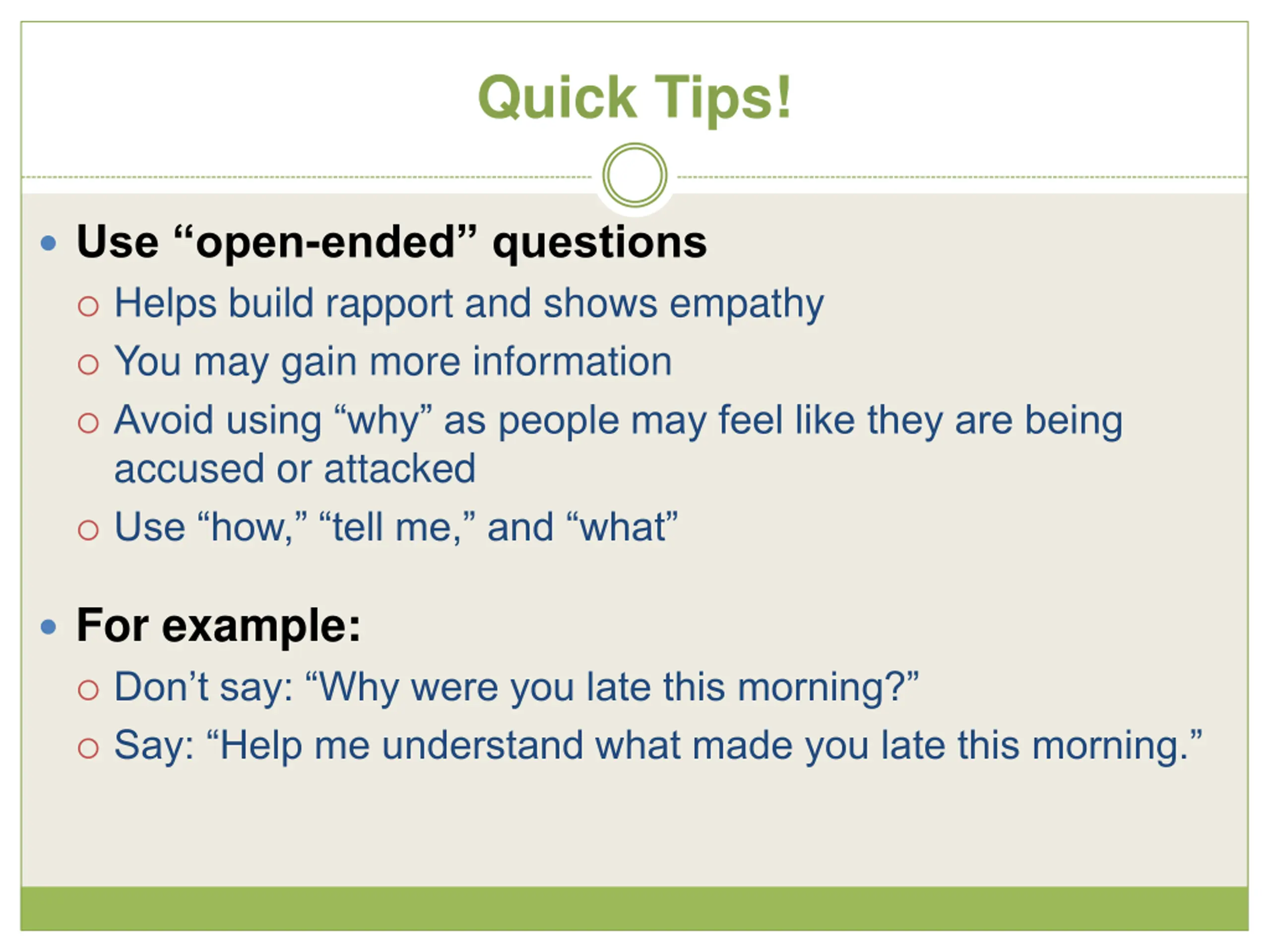 Quick Tips! Use open-ended questions Helps build rapport and shows empathy You may gain more information Avoid using why as people may feel like they are being accused or attacked Use how, tell me, and what For example: Don t say: Why were you late this morning? Say: Help me understand what made you late this morning.