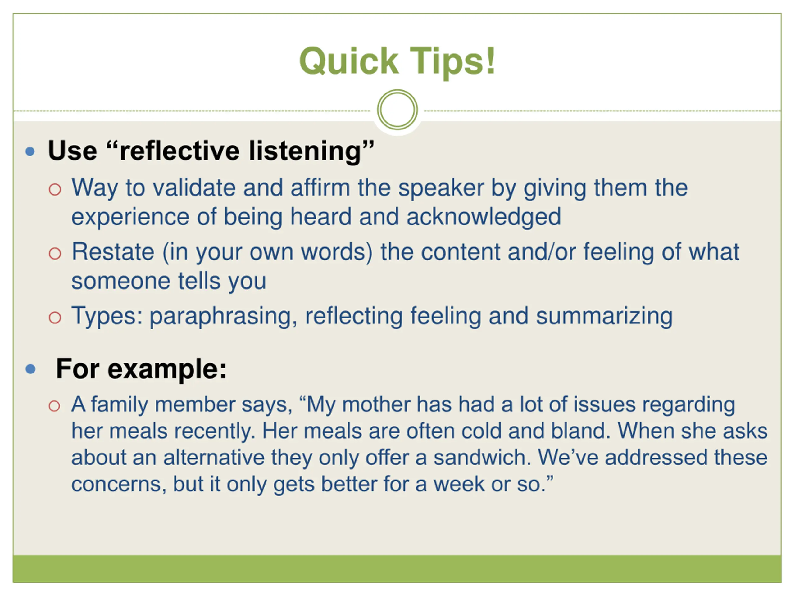 Quick Tips! Use reflective listening Way to validate and affirm the speaker by giving them the experience of being heard and acknowledged Restate (in your own words) the content and/or feeling of what someone tells you Types: paraphrasing, reflecting feeling and summarizing For example: A family member says, My mother has had a lot of issues regarding her meals recently. Her meals are often cold and bland. When she asks about an alternative they only offer a sandwich. We ve addressed these concerns, but it only gets better for a week or so.