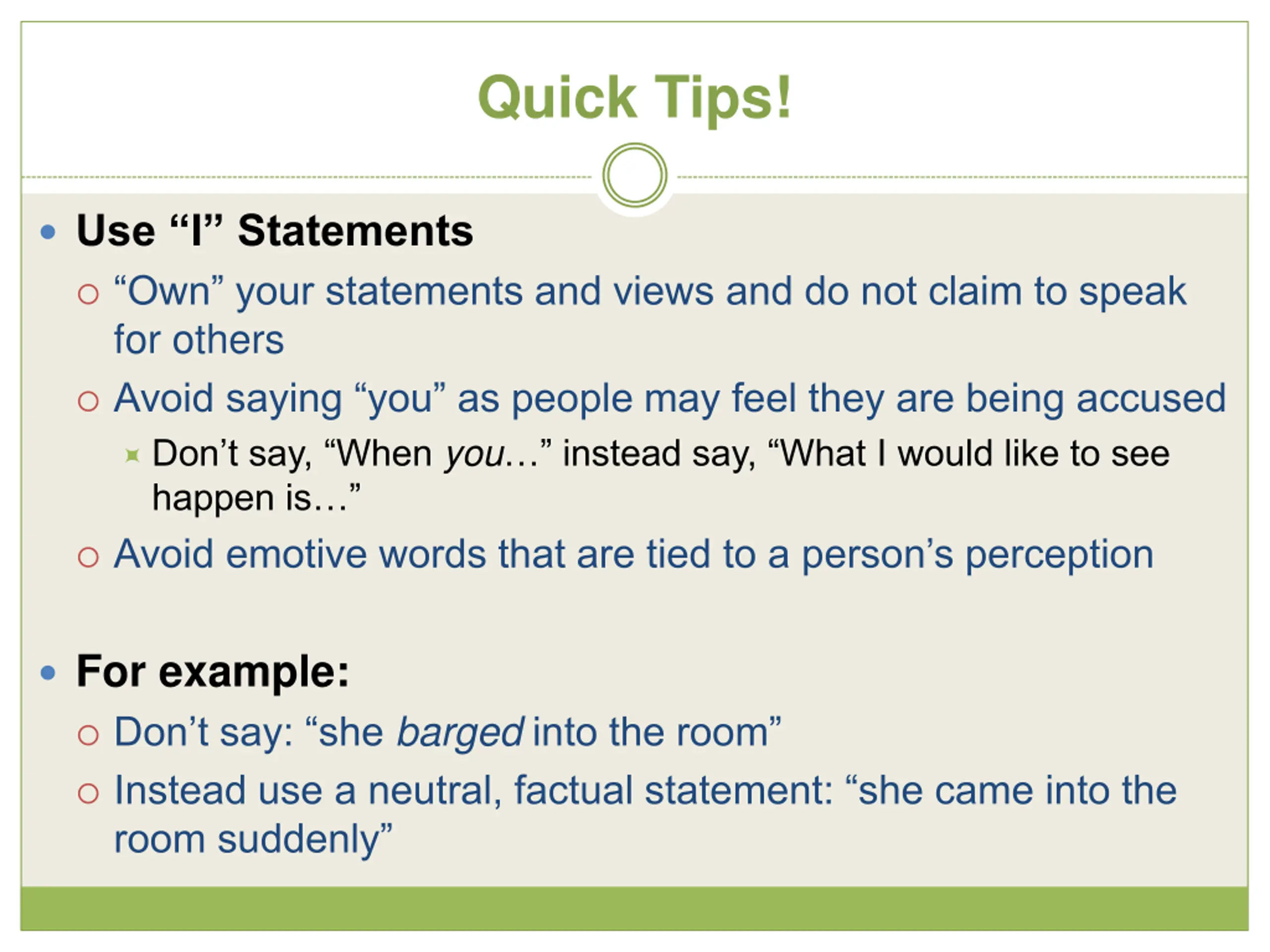 Quick Tips! Use I Statements Own your statements and views and do not claim to speak for others Avoid saying you as people may feel they are being accused Don t say, When you instead say, What I would like to see happen is Avoid emotive words that are tied to a person s perception For example: Don t say: she barged into the room Instead use a neutral, factual statement: she came into the room suddenly