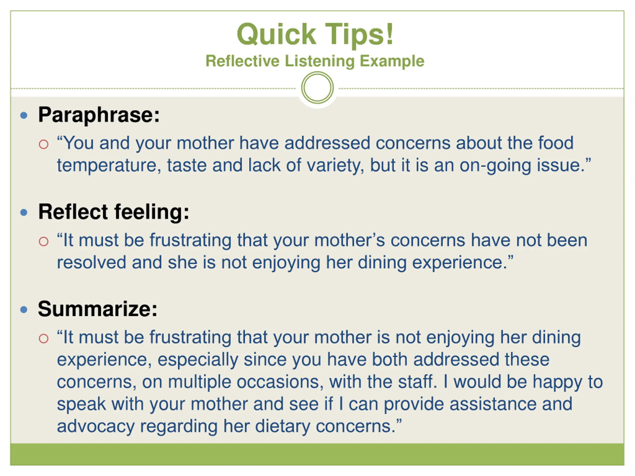 Quick Tips! Reflective Listening Example Paraphrase: You and your mother have addressed concerns about the food temperature, taste and lack of variety, but it is an on-going issue. Reflect feeling: It must be frustrating that your mother s concerns have not been resolved and she is not enjoying her dining experience. Summarize: It must be frustrating that your mother is not enjoying her dining experience, especially since you have both addressed these concerns, on multiple occasions, with the staff. I would be happy to speak with your mother and see if I can provide assistance and advocacy regarding her dietary concerns.