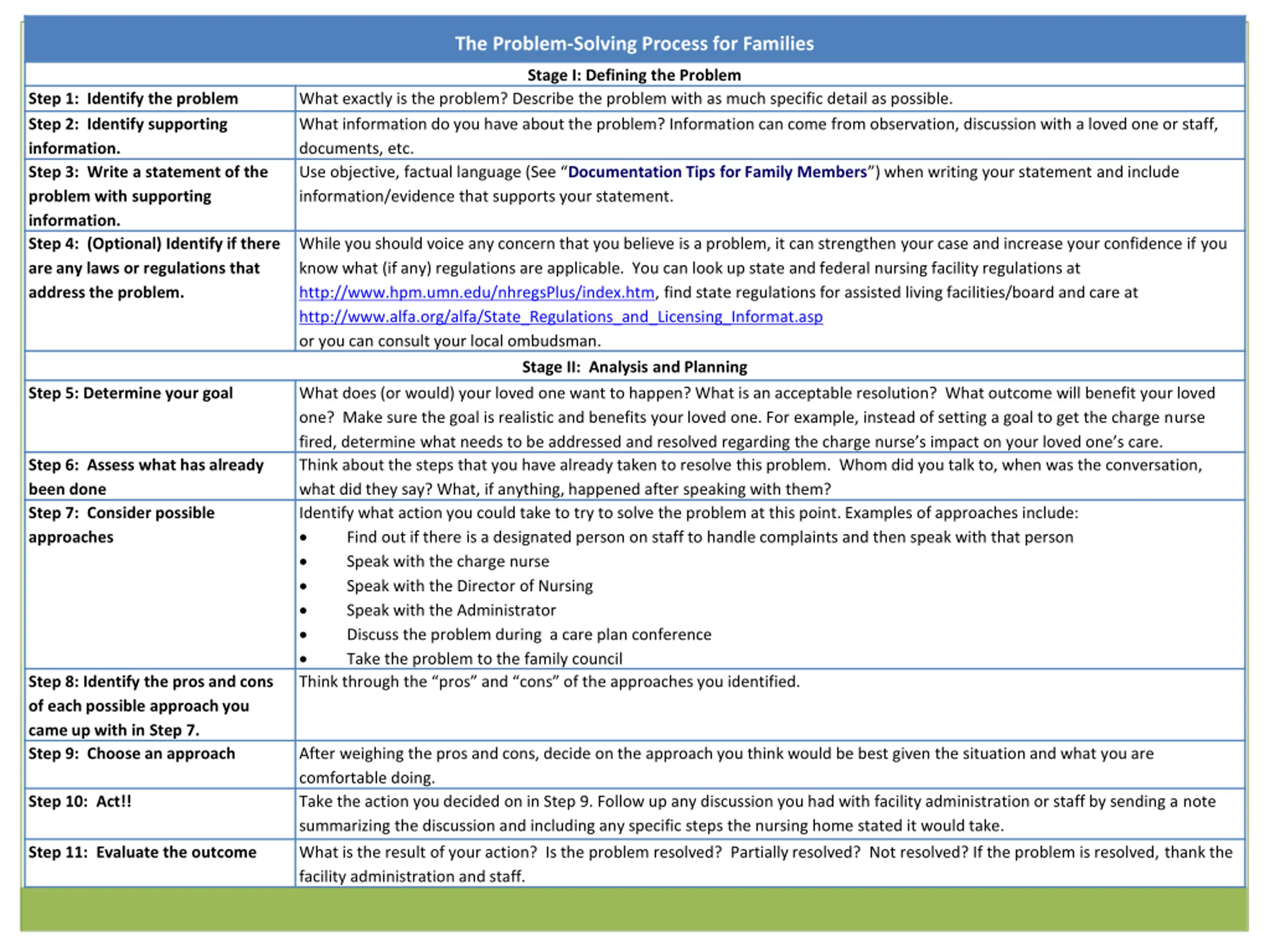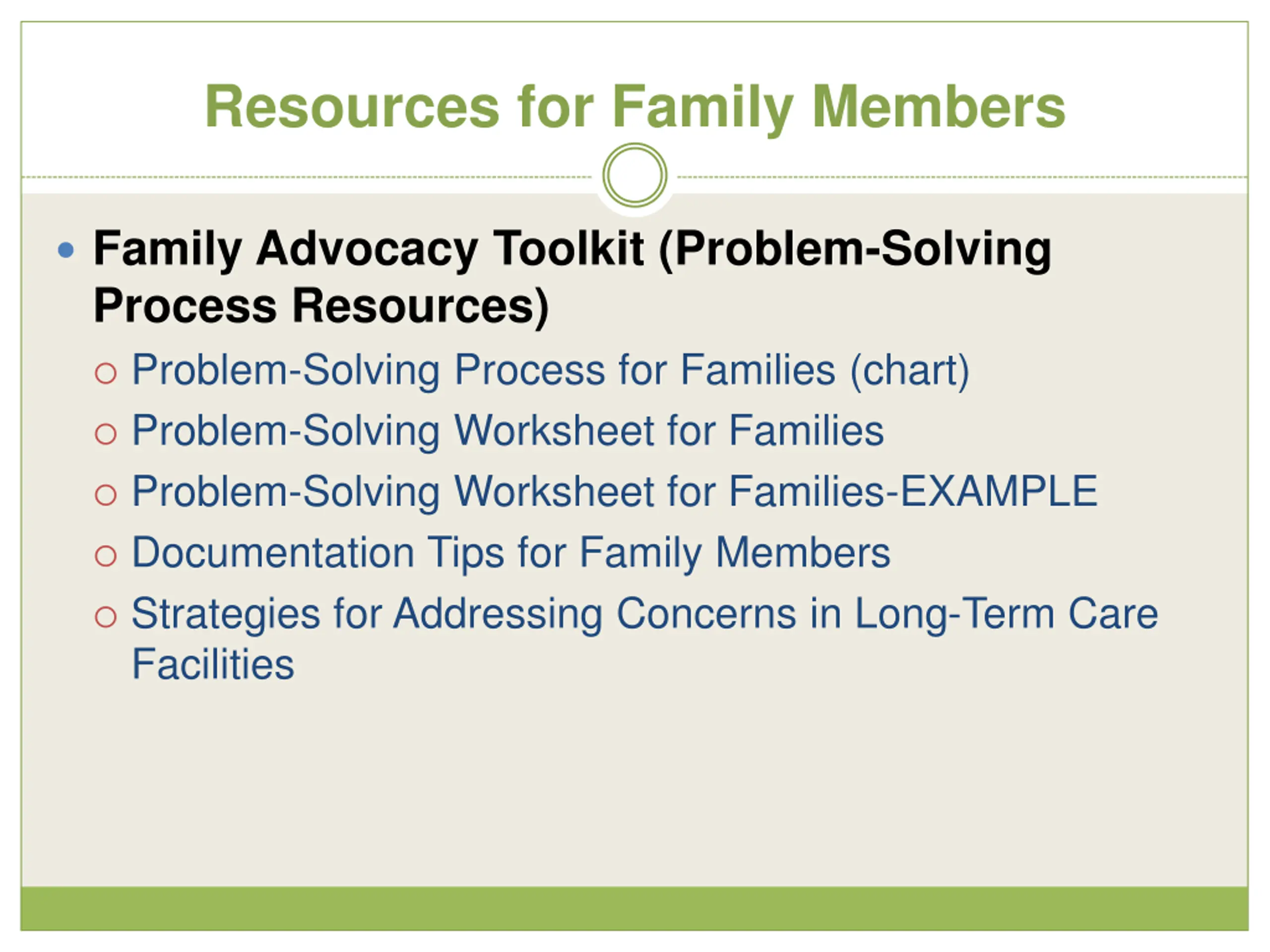 Resources for Family Members Family Advocacy Toolkit (Problem-Solving Process Resources) Problem-Solving Process for Families (chart) Problem-Solving Worksheet for Families Problem-Solving Worksheet for Families-EXAMPLE Documentation Tips for Family Members Strategies for Addressing Concerns in Long-Term Care Facilities