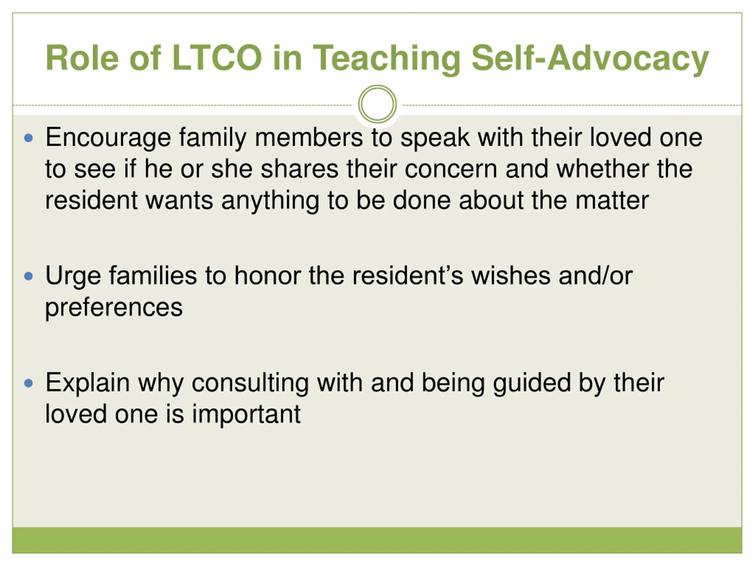 Role of LTCO in Teaching Self-Advocacy Encourage family members to speak with their loved one to see if he or she shares their concern and whether the resident wants anything to be done about the matter Urge families to honor the resident s wishes and/or preferences Explain why consulting with and being guided by their loved one is important