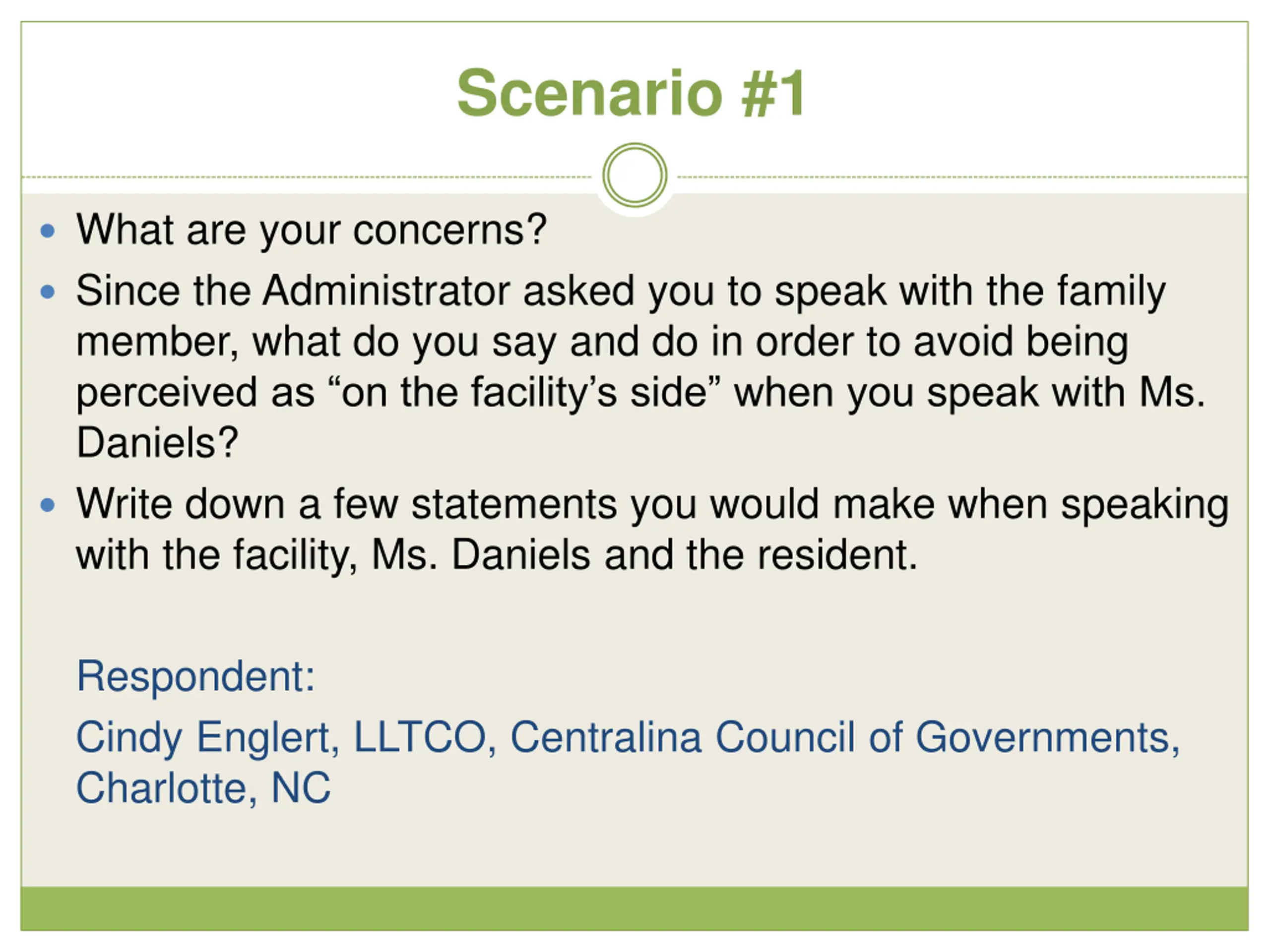 Scenario #1 What are your concerns? Since the Administrator asked you to speak with the family member, what do you say and do in order to avoid being perceived as on the facility s side when you speak with Ms. Daniels? Write down a few statements you would make when speaking with the facility, Ms. Daniels and the resident. Respondent: Cindy Englert, LLTCO, Centralina Council of Governments, Charlotte, NC