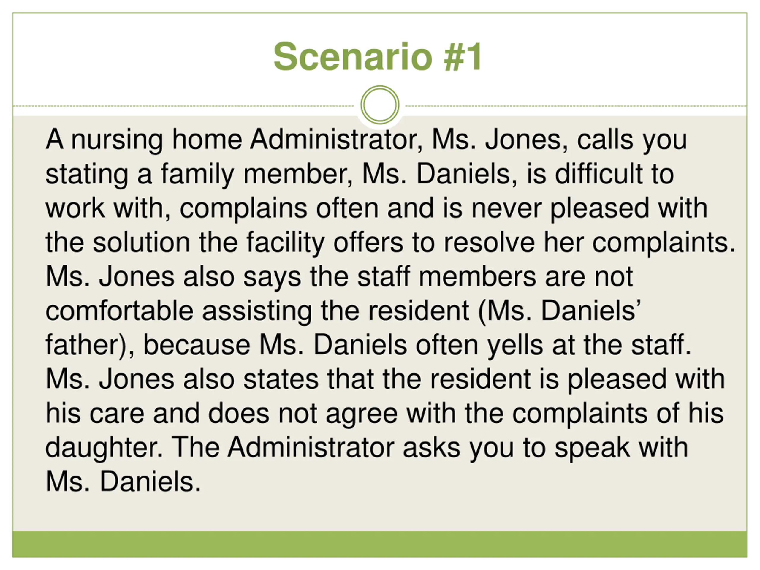 Scenario #1 A nursing home Administrator, Ms. Jones, calls you stating a family member, Ms. Daniels, is difficult to work with, complains often and is never pleased with the solution the facility offers to resolve her complaints. Ms. Jones also says the staff members are not comfortable assisting the resident (Ms. Daniels father), because Ms. Daniels often yells at the staff. Ms. Jones also states that the resident is pleased with his care and does not agree with the complaints of his daughter. The Administrator asks you to speak with Ms. Daniels.